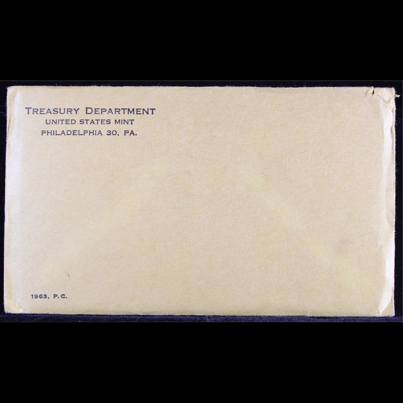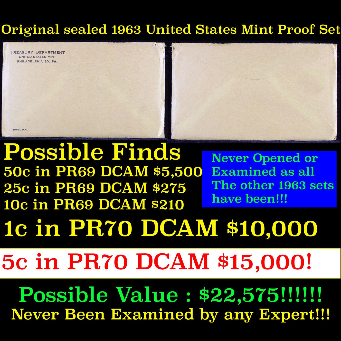 Original sealed 1963 United States Mint Proof Set. Up for Auction is an Unopened 1963 Proof Set In Original Envelope! The Proof set in this Envelope has never been reviewed or examined by anyone. Virtually every 1963 Proof Set has been looked at by Coin Experts who have identified potential PR69 DCAM Coins and had them slabbed. Those opened Proof Sets you find at coin shows or for sale individually have almost certainly been examined and reviewed., So, What COULD be in This Set, Well here are the 5 things that could be inside A Franklin 50c in PR69 DCAM Trending $5,500, a Washington 25c in PR69 DCAM Trending $275, a Roosevelt Dime in PR69 DCAM Trending $210, BUT That’s Just the Start, There also could be a Jefferson 5c in PR70 DCAM, TRENDING $15,000, BUT EVEN THAT IS JUST THE SIDESHOW! The REAL WINNER IN THIS LOTTERY BOX IS The Lincoln Penny, a 1963 PROOF Lincoln 1c in PR70 DCAM TRENDS $10,000 This could be one of the very last Sealed Envelopes in EXISTENCE. This “WONKA” Box could Contain Coins Worth $22,575 - Good Luck in Obtaining This Unopened 1963 Proof Set!!!