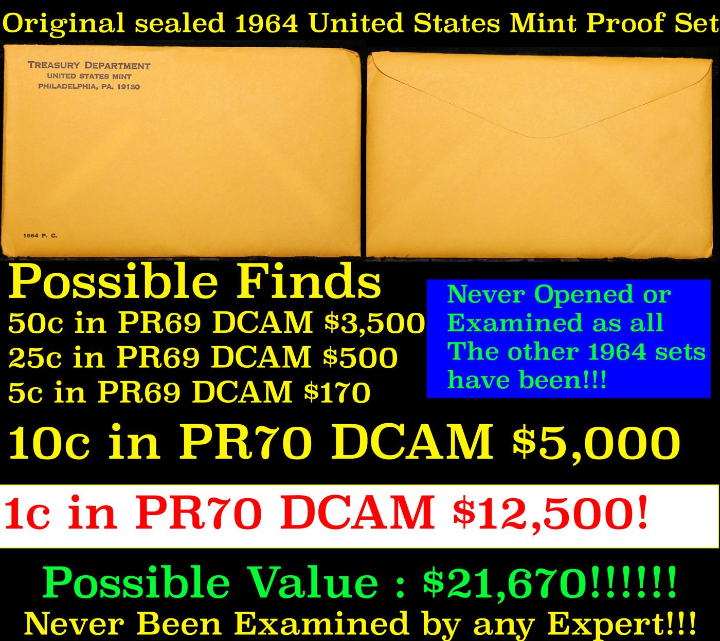 Original sealed 1964 United States Mint Proof Set! 5 Coins Inside!. Up for Auction is an Unopened 1964 Proof Set In Original Envelope! The Proof set in this Envelope has never been reviewed or examined by anyone. Virtually every 1964 Proof Set has been looked at by Coin Experts who have identified potential PR70 DCAM Coins and had them slabbed. Those opened Proof Sets you find at coin shows or for sale individually have almost certainly been examined and reviewed., So, What COULD be in This Set, Well here are the 5 things that could be inside A Kennedy 50c in PR69 DCAM Trending $3,500, a Washington 25c in PR69 DCAM Trending $500, a Roosevelt Dime in PR70 DCAM Trending $5000, , There also could be a Jefferson 5c in PR69 DCAM, TRENDING $170 BUT EVEN THAT IS JUST THE SIDESHOW! The REAL WINNER IN THIS LOTTERY BOX IS The Lincoln Penny, a 1964 PROOF Lincoln 1c in PR70 DCAM TRENDS $12,500 This could be one of the very last Sealed Envelopes in EXISTENCE. This “WONKA” Box could Contain Coins Worth $21,670 - Good Luck in Obtaining This Unopened 1964 Proof Set!!!