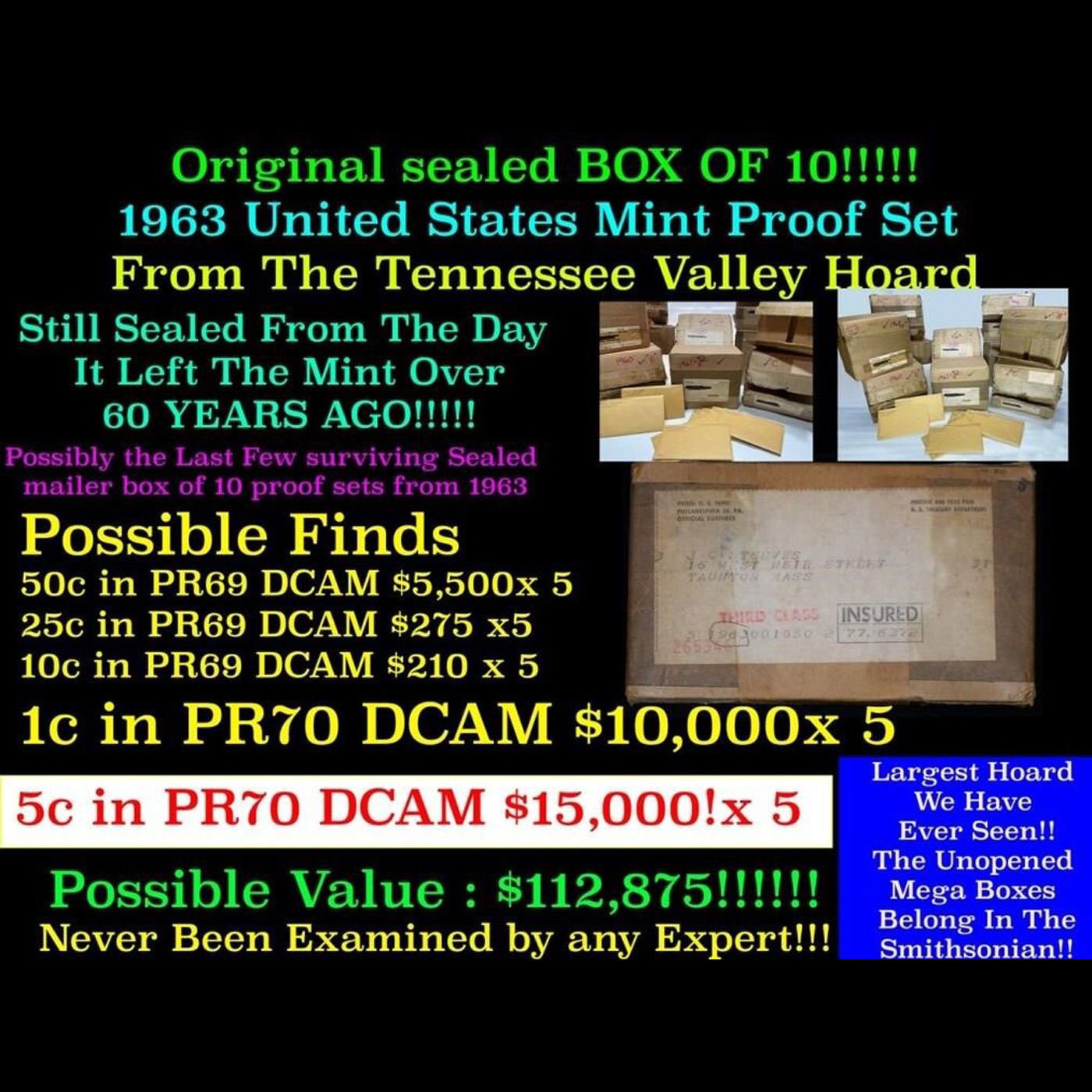 Original sealed Box of 5x 1963 United States Mint Proof Set Tennessee Valley Hoard. Original sealed 1959 United States Mint Proof Set Tennessee Valley Hoard. Once in a lifetime collection We are proud to bring to auction the greatest proof collection of the late 1950s and early 1960s. This collection may contain some of the only unopened mega boxes of unopened proof sets still in existence. In all my years in numismatics I have never seen a collection like this one. The collection includes 3 unopened mega boxes as well as approximately 7 mega boxes that have been carefully opened but the sets inside remain pristine and unopened as they were when they left the philadelphia mint over a half century ago. Finding cameo and deep cameo proofs from this era is near impossible u less you pay full retail and buy them already holdered. All of the sets at coin shows have been examined and have virtually no cameos. The only way to get the same odds of finding one of these valuable cameos is to buy an unopened set. Many sets today that are purported to be unopened have a actually been opened and resealed or put into a fresh envelope and sealed. This 100% original lot is guaranteed to be unopened from the day it left the mint. We will cover your laboratory costs and pay you 10x your cost of the set if the carbon dating on this set shows that the glue is not from the late 1950s 1960s. A true once in a lifetime opportunity