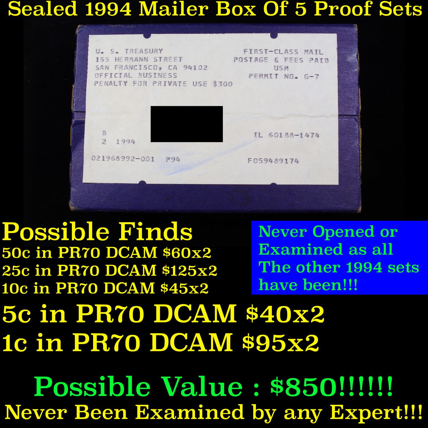 Original sealed box 2- 1994 United States Mint Proof Sets. Up for Auction is an Unopened Mailer Box from 1994 containing 2 1994 Proof Sets!!!! Wow! - This Mailer Box is sealed exactly as it left the mint over 30 years ago. Each Proof set in this mailer box has never been reviewed or examined by anyone. Virtually every 1994 Proof Set has been looked at by Coin Experts who have identified potential PR70 DCAM Coins and had them slabbed. Those opened Proof Sets you find at coin shows or for sale individually have almost certainly been examined and reviewed. NOT ONE OF THE FIVE SETS IN THIS MAILER BOX HAVE BEEN SEEN BY HUMAN EYES IN 40 YEARS , So, What COULD be in these Sets, Well here are the 5 things that could be inside. An Kennedy 50c in PR70 DCAM Trending $60, a Washington 25c in PR70 DCAM Trending $125, a Roosevelt Dime in PR70 DCAM Trending $45, BUT That’s Just the Start, There also could be a Jefferson 5c in PR70 DCAM, TRENDING $40 & a Lincoln 1c in PR70 DCAM Trending $95! And there can be TWO of Each in this BOX, This could be one of the very last boxes in EXISTENCE. This “WONKA” Box could Contain Coins Worth $730 - Good Luck in Obtaining This Unopened Mailer Box of 2 1994 Proof Sets!!!