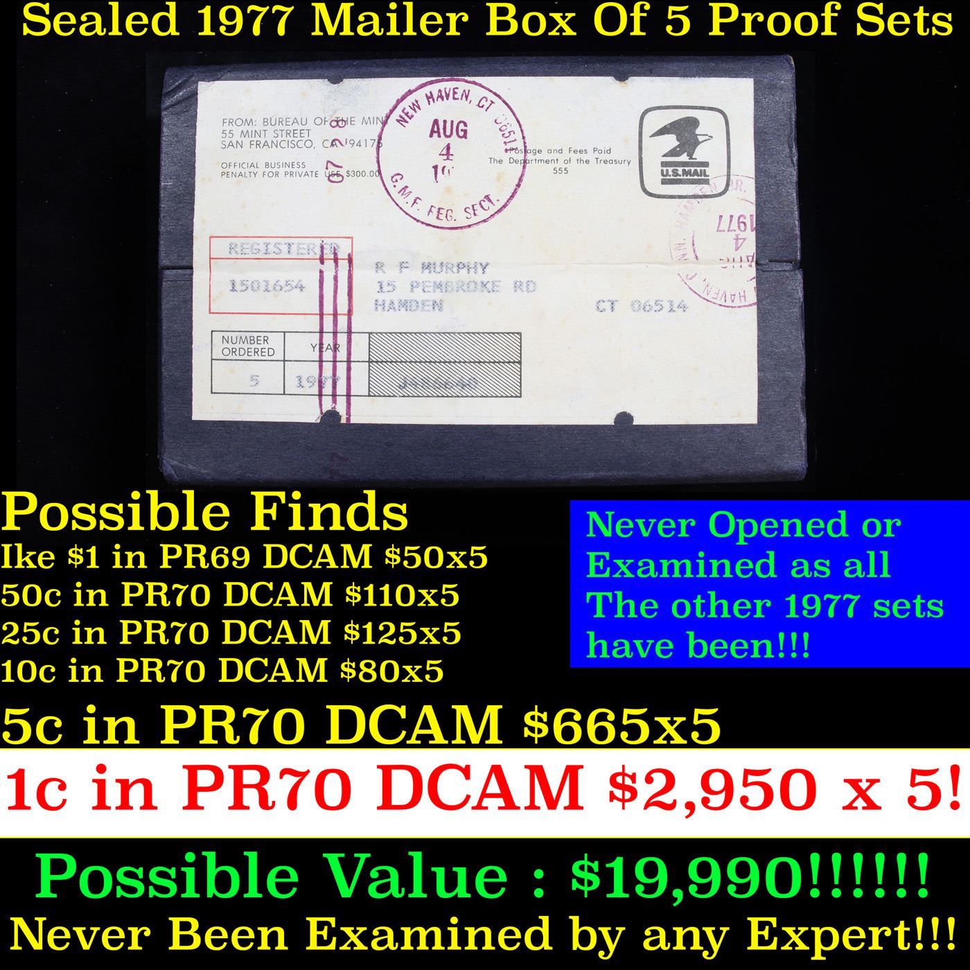 Original sealed box 5- 1977 United States Mint Proof Sets. Up for Auction is an Unopened Mailer Box from 1977 containing 5 1977 Proof Sets!!!! Wow! - This Mailer Box is sealed exactly as it left the mint over 40 years ago. Each Proof set in this mailer box has never been reviewed or examined by anyone. Virtually every 1978Proof Set has been looked at by Coin Experts who have identified potential PR70 DCAM Coins and had them slabbed. Those opened Proof Sets you find at coin shows or for sale individually have almost certainly been examined and reviewed. NOT ONE OF THE FIVE SETS IN THIS MAILER BOX HAVE BEEN SEEN BY HUMAN EYES IN 40 YEARS , So, What COULD be in these Sets, Well here are the 5 things that could be inside. A Ike $1 in PR70 DCAM Trending $50, A Kennedy 50c in PR70 DCAM Trending $110, a Washington 25c in PR70 DCAM Trending $125, a Roosevelt Dime in PR70 DCAM Trending $80, BUT That’s Just the Start, There also could be a Jefferson 5c in PR70 DCAM, TRENDING $665, BUT EVEN THAT IS JUST THE SIDESHOW! The REAL WINNER IN THIS LOTTERY BOX IS The Lincoln Penny, a 1977 PROOF Lincoln 1c in PR70 DCAM TRENDS $2,950!!!! And there can be FIVE of Each in this BOX, This could be one of the very last boxes in EXISTENCE. This “WONKA” Box could Contain Coins Worth $19,990 - Good Luck in Obtaining This Unopened Mailer Box of 5 1977 Proof Sets!!!