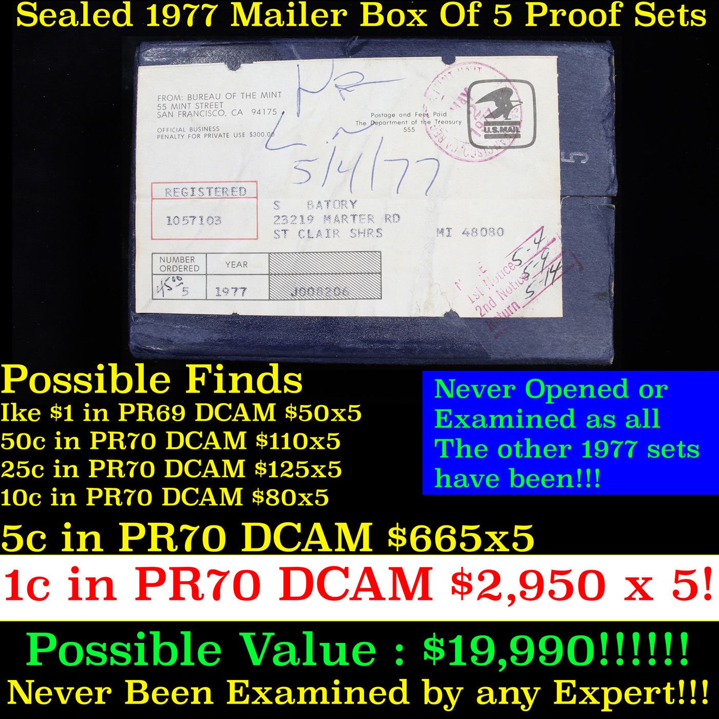Original sealed box 5- 1977 United States Mint Proof Sets. Up for Auction is an Unopened Mailer Box from 1977 containing 5 1977 Proof Sets!!!! Wow! - This Mailer Box is sealed exactly as it left the mint over 40 years ago. Each Proof set in this mailer box has never been reviewed or examined by anyone. Virtually every 1978Proof Set has been looked at by Coin Experts who have identified potential PR70 DCAM Coins and had them slabbed. Those opened Proof Sets you find at coin shows or for sale individually have almost certainly been examined and reviewed. NOT ONE OF THE FIVE SETS IN THIS MAILER BOX HAVE BEEN SEEN BY HUMAN EYES IN 40 YEARS , So, What COULD be in these Sets, Well here are the 5 things that could be inside. A Ike $1 in PR70 DCAM Trending $50, A Kennedy 50c in PR70 DCAM Trending $110, a Washington 25c in PR70 DCAM Trending $125, a Roosevelt Dime in PR70 DCAM Trending $80, BUT That’s Just the Start, There also could be a Jefferson 5c in PR70 DCAM, TRENDING $665, BUT EVEN THAT IS JUST THE SIDESHOW! The REAL WINNER IN THIS LOTTERY BOX IS The Lincoln Penny, a 1977 PROOF Lincoln 1c in PR70 DCAM TRENDS $2,950!!!! And there can be FIVE of Each in this BOX, This could be one of the very last boxes in EXISTENCE. This “WONKA” Box could Contain Coins Worth $19,990 - Good Luck in Obtaining This Unopened Mailer Box of 5 1977 Proof Sets!!!