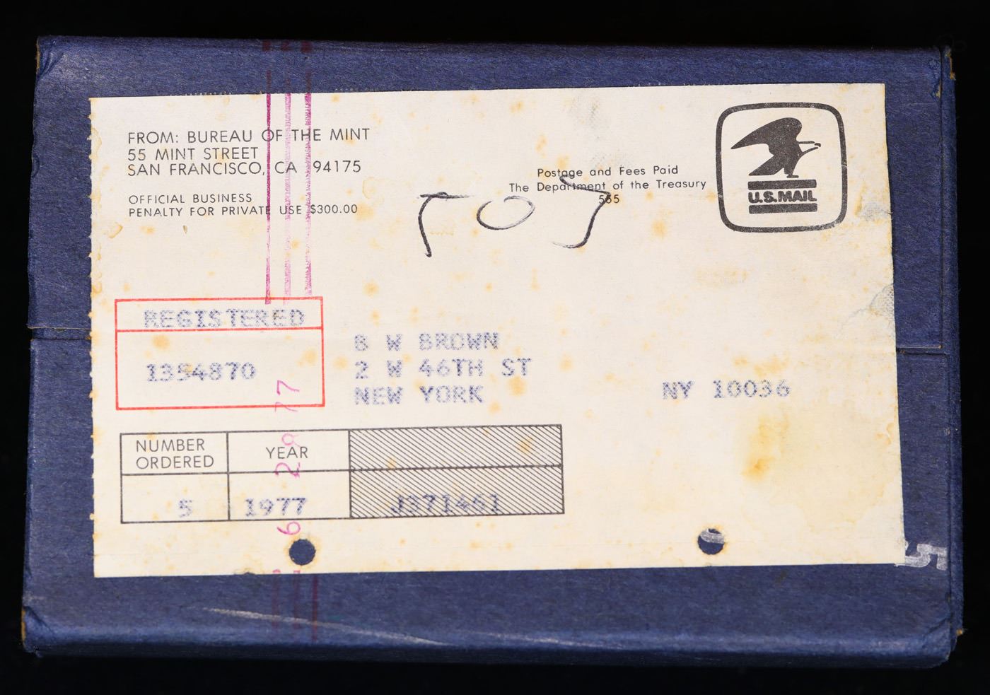 Original sealed box 5- 1977 United States Mint Proof Sets. Up for Auction is an Unopened Mailer Box from 1977 containing 5 1977 Proof Sets!!!! Wow! - This Mailer Box is sealed exactly as it left the mint over 40 years ago. Each Proof set in this mailer box has never been reviewed or examined by anyone. Virtually every 1978Proof Set has been looked at by Coin Experts who have identified potential PR70 DCAM Coins and had them slabbed. Those opened Proof Sets you find at coin shows or for sale individually have almost certainly been examined and reviewed. NOT ONE OF THE FIVE SETS IN THIS MAILER BOX HAVE BEEN SEEN BY HUMAN EYES IN 40 YEARS , So, What COULD be in these Sets, Well here are the 5 things that could be inside. A Ike $1 in PR70 DCAM Trending $50, A Kennedy 50c in PR70 DCAM Trending $110, a Washington 25c in PR70 DCAM Trending $125, a Roosevelt Dime in PR70 DCAM Trending $80, BUT That’s Just the Start, There also could be a Jefferson 5c in PR70 DCAM, TRENDING $665, BUT EVEN THAT IS JUST THE SIDESHOW! The REAL WINNER IN THIS LOTTERY BOX IS The Lincoln Penny, a 1977 PROOF Lincoln 1c in PR70 DCAM TRENDS $2,950!!!! And there can be FIVE of Each in this BOX, This could be one of the very last boxes in EXISTENCE. This “WONKA” Box could Contain Coins Worth $19,990 - Good Luck in Obtaining This Unopened Mailer Box of 5 1977 Proof Sets!!!