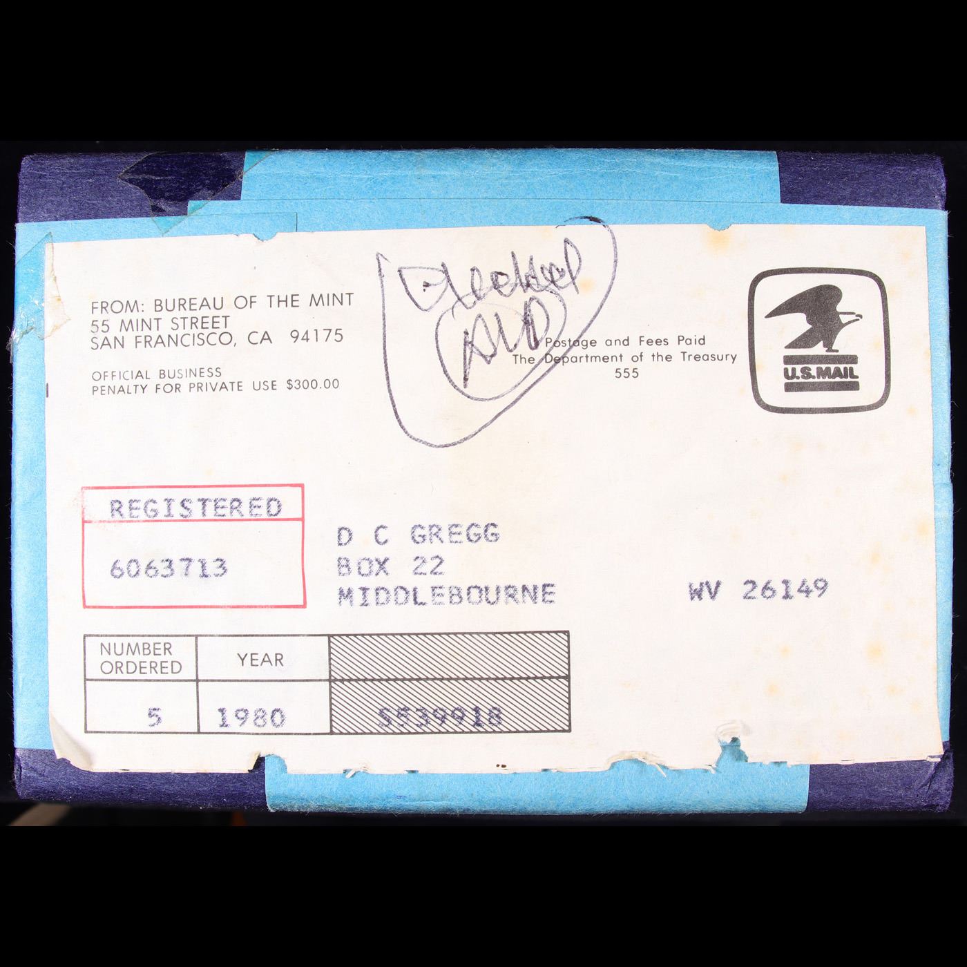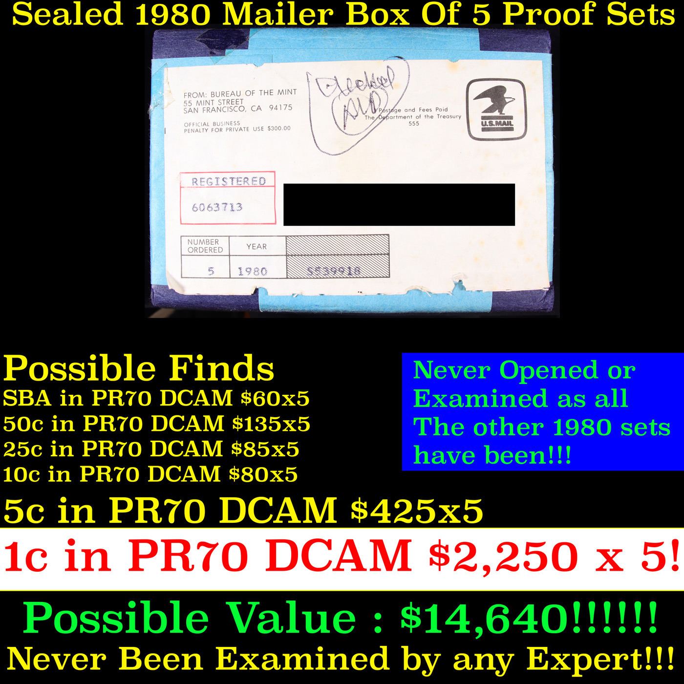 Original sealed box 5- 1980 United States Mint Proof Sets. Up for Auction is an Unopened Mailer Box from 1980 containing 5 1980 Proof Sets!!!! Wow! - This Mailer Box is sealed exactly as it left the mint over 40 years ago. Each Proof set in this mailer box has never been reviewed or examined by anyone. Virtually every 1980 Proof Set has been looked at by Coin Experts who have identified potential PR70 DCAM Coins and had them slabbed. Those opened Proof Sets you find at coin shows or for sale individually have almost certainly been examined and reviewed. NOT ONE OF THE FIVE SETS IN THIS MAILER BOX HAVE BEEN SEEN BY HUMAN EYES IN 40 YEARS , So, What COULD be in these Sets, Well here are the 6 things that could be inside. A SBA $1 in PR70 DCAM Trending $60, A Kennedy 50c in PR70 DCAM Trending $135, a Washington 25c in PR70 DCAM Trending $85, a Roosevelt Dime in PR70 DCAM Trending $80, BUT That’s Just the Start, There also could be a Jefferson 5c in PR70 DCAM, TRENDING $425, BUT EVEN THAT IS JUST THE SIDESHOW! The REAL WINNER IN THIS LOTTERY BOX IS The Lincoln Penny, a 1980 PROOF Lincoln 1c in PR70 DCAM TRENDS $2,250!!!! And there can be FIVE of Each in this BOX, This could be one of the very last boxes in EXISTENCE. This “WONKA” Box could Contain Coins Worth $14,640 - Good Luck in Obtaining This Unopened Mailer Box of 5 1980 Proof Sets!!!