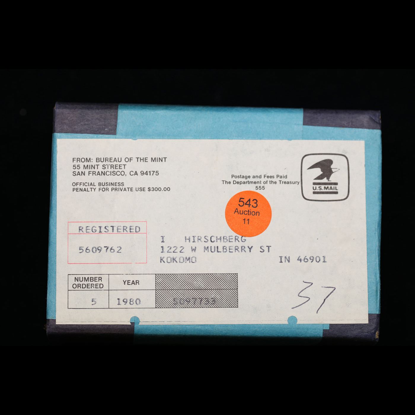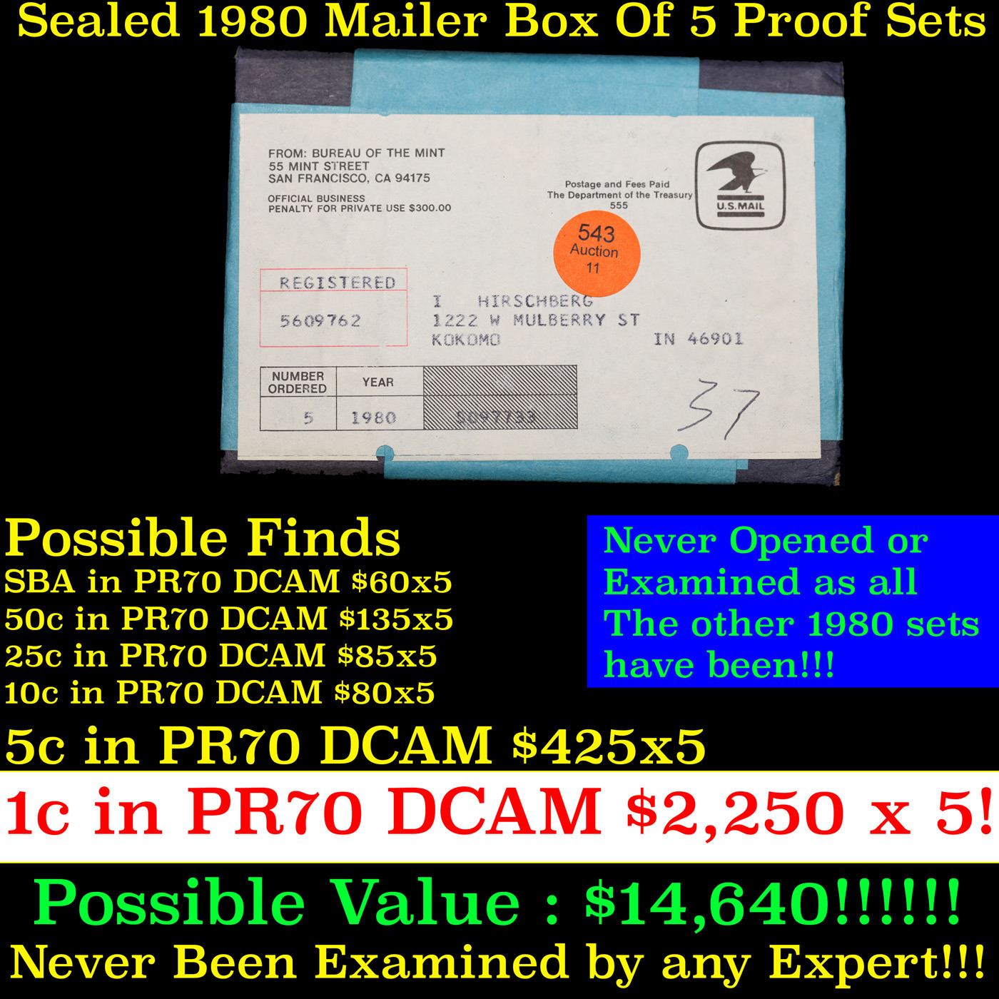 Original sealed box 5- 1980 United States Mint Proof Sets. Up for Auction is an Unopened Mailer Box from 1989 containing 5 1989 Proof Sets!!!! Wow! - This Mailer Box is sealed exactly as it left the mint over 40 years ago. Each Proof set in this mailer box has never been reviewed or examined by anyone. Virtually every 1989 Proof Set has been looked at by Coin Experts who have identified potential PR70 DCAM Coins and had them slabbed. Those opened Proof Sets you find at coin shows or for sale individually have almost certainly been examined and reviewed. NOT ONE OF THE FIVE SETS IN THIS MAILER BOX HAVE BEEN SEEN BY HUMAN EYES IN 40 YEARS , So, What COULD be in these Sets, Well here are the 5 things that could be inside. An Kennedy 50c in PR70 DCAM Trending $60, a Washington 25c in PR70 DCAM Trending $70, a Roosevelt Dime in PR70 DCAM Trending $65, BUT That’s Just the Start, There also could be a Jefferson 5c in PR70 DCAM, TRENDING $115 & a Lincoln 1c in PR70 DCAM Trending $120!!!! And there can be FIVE of Each in this BOX, This could be one of the very last boxes in EXISTENCE. This “WONKA” Box could Contain Coins Worth $2600 - Good Luck in Obtaining This Unopened Mailer Box of 5 1989 Proof Sets!!!