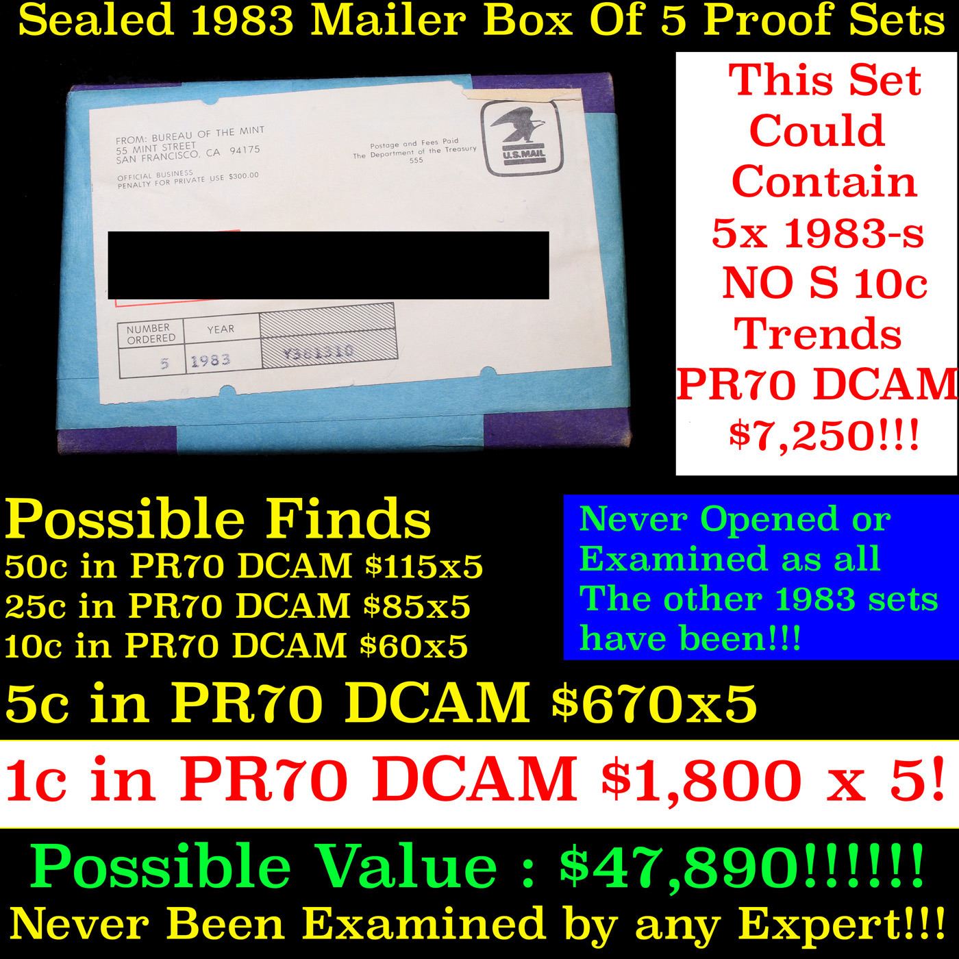 Original sealed box 5- 1983 United States Mint Proof Sets. Up for Auction is an Unopened Mailer Box from 1983 containing 5 1983 Proof Sets!!!! Wow! - This Mailer Box is sealed exactly as it left the mint over 40 years ago. Each Proof set in this mailer box has never been reviewed or examined by anyone. Virtually every 1983 Proof Set has been looked at by Coin Experts who have identified potential PR70 DCAM Coins and had them slabbed. Those opened Proof Sets you find at coin shows or for sale individually have almost certainly been examined and reviewed. NOT ONE OF THE FIVE SETS IN THIS MAILER BOX HAVE BEEN SEEN BY HUMAN EYES IN 40 YEARS , So, What COULD be in these Sets, Well here are the 5 things that could be inside. An Kennedy 50c in PR70 DCAM Trending $115, a Washington 25c in PR70 DCAM Trending $85, a Roosevelt Dime in PR70 DCAM Trending $60, BUT ThatÕs Just the Start, There also could be a Jefferson 5c in PR70 DCAM, TRENDING $670 & a Lincoln 1c in PR70 DCAM Trending $1,800!!!! BUT EVEN THAT IS JUST THE SIDESHOW! The REAL WINNER IN THIS LOTTERY BOX IS The 1983-s No S Roosevelt 10c ONLY FOUND IN THIS SET, a 1983-s Proof No S Roosevelt 10c in PR70 DCAM TRENDS $7,250!!!! And there can be FIVE of Each in this BOX, This could be one of the very last boxes in EXISTENCE. This ÒWONKAÓ Box could Contain Coins Worth $47,890 - Good Luck in Obtaining This Unopened Mailer Box of 5 1983 Proof Sets!!!