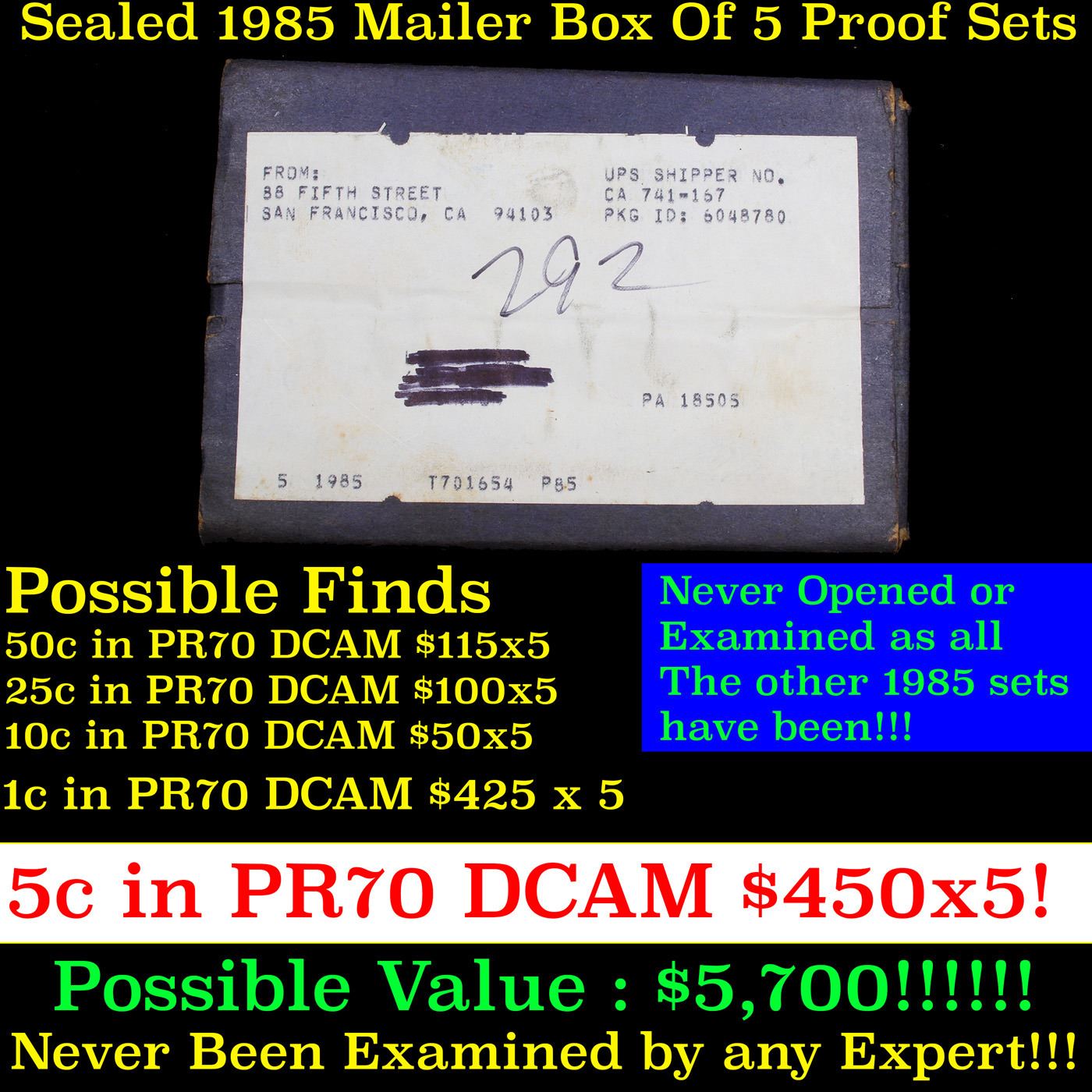 Original sealed box 5- 1985 United States Mint Proof Sets. Up for Auction is an Unopened Mailer Box from 1985 containing 5 1985 Proof Sets!!!! Wow! - This Mailer Box is sealed exactly as it left the mint over 40 years ago. Each Proof set in this mailer box has never been reviewed or examined by anyone. Virtually every 1985 Proof Set has been looked at by Coin Experts who have identified potential PR70 DCAM Coins and had them slabbed. Those opened Proof Sets you find at coin shows or for sale individually have almost certainly been examined and reviewed. NOT ONE OF THE FIVE SETS IN THIS MAILER BOX HAVE BEEN SEEN BY HUMAN EYES IN 40 YEARS , So, What COULD be in these Sets, Well here are the 5 things that could be inside. A Kennedy 50c in PR70 DCAM Trending $115, a Washington 25c in PR70 DCAM Trending $100, a Roosevelt Dime in PR70 DCAM Trending $50, BUT That’s Just the Start, There also could be a Jefferson 5c in PR70 DCAM, TRENDING $450, BUT EVEN THAT IS JUST THE SIDESHOW! The REAL WINNER IN THIS LOTTERY BOX IS The Lincoln Penny, a 1985 PROOF Lincoln 1c in PR70 DCAM TRENDS $425!!!! And there can be FIVE of Each in this BOX, This could be one of the very last boxes in EXISTENCE. This “WONKA” Box could Contain Coins Worth $5,700 - Good Luck in Obtaining This Unopened Mailer Box of 5 1985 Proof Sets!!!