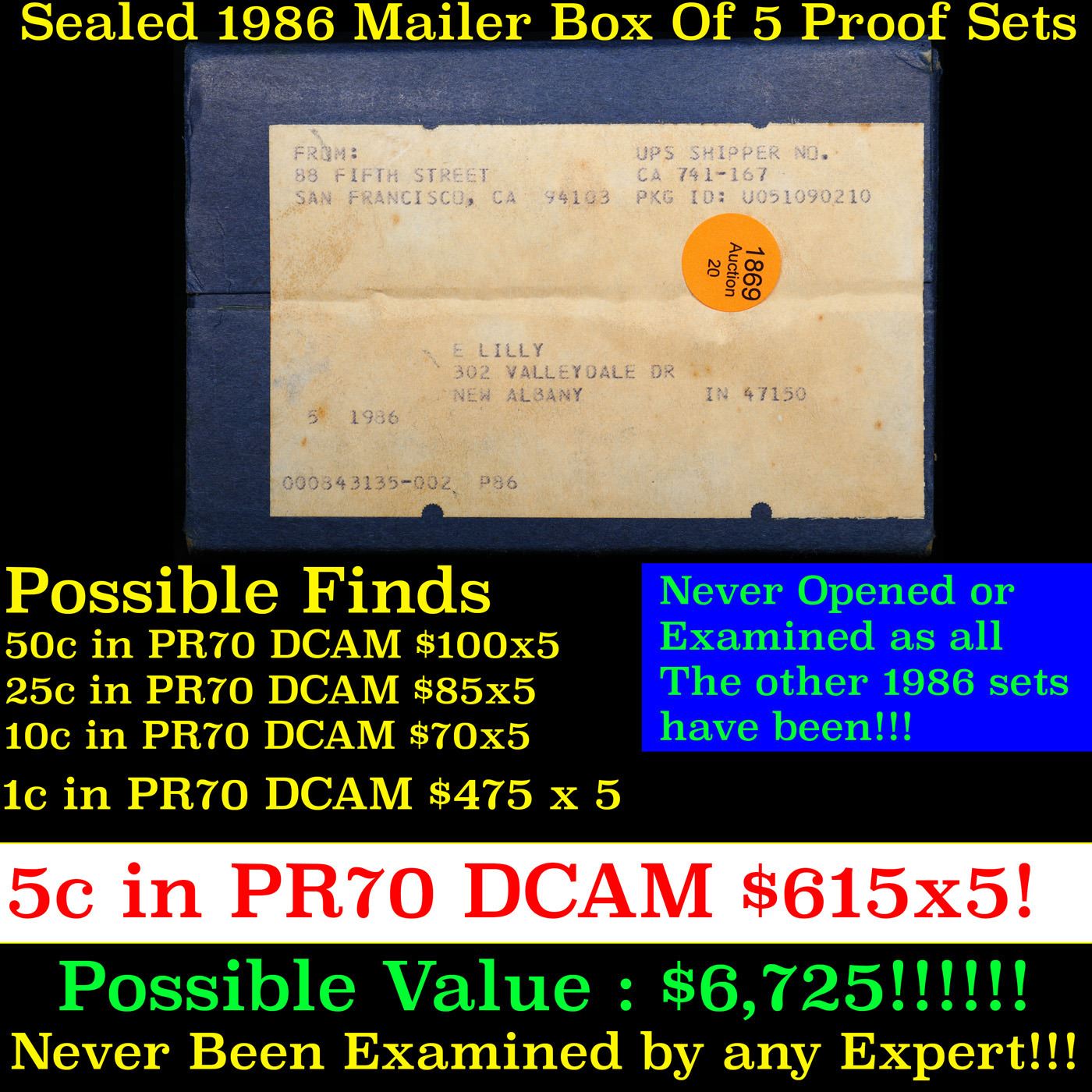 Original sealed box 5- 1986 United States Mint Proof Sets. Up for Auction is an Unopened Mailer Box from 1986 containing 5 1986 Proof Sets!!!! Wow! - This Mailer Box is sealed exactly as it left the mint over 40 years ago. Each Proof set in this mailer box has never been reviewed or examined by anyone. Virtually every 1986 Proof Set has been looked at by Coin Experts who have identified potential PR70 DCAM Coins and had them slabbed. Those opened Proof Sets you find at coin shows or for sale individually have almost certainly been examined and reviewed. NOT ONE OF THE FIVE SETS IN THIS MAILER BOX HAVE BEEN SEEN BY HUMAN EYES IN 40 YEARS , So, What COULD be in these Sets, Well here are the 5 things that could be inside. An Kennedy 50c in PR70 DCAM Trending $90, a Washington 25c in PR70 DCAM Trending $60, a Roosevelt Dime in PR70 DCAM Trending $60, BUT ThatÕs Just the Start, There also could be a Lincoln 1c in PR70 DCAM, TRENDING $550 BUT EVEN THAT IS JUST THE SIDESHOW! The REAL WINNER IN THIS LOTTERY BOX IS The 1986-s Jefferson 5c, a 1986-s Proof Jefferson 5c in PR70 DCAM TRENDS $2,200!!!! And there can be FIVE of Each in this BOX, This could be one of the very last boxes in EXISTENCE. This ÒWONKAÓ Box could Contain Coins Worth $47,890 - Good Luck in Obtaining This Unopened Mailer Box of 5 1986 Proof Sets!!!