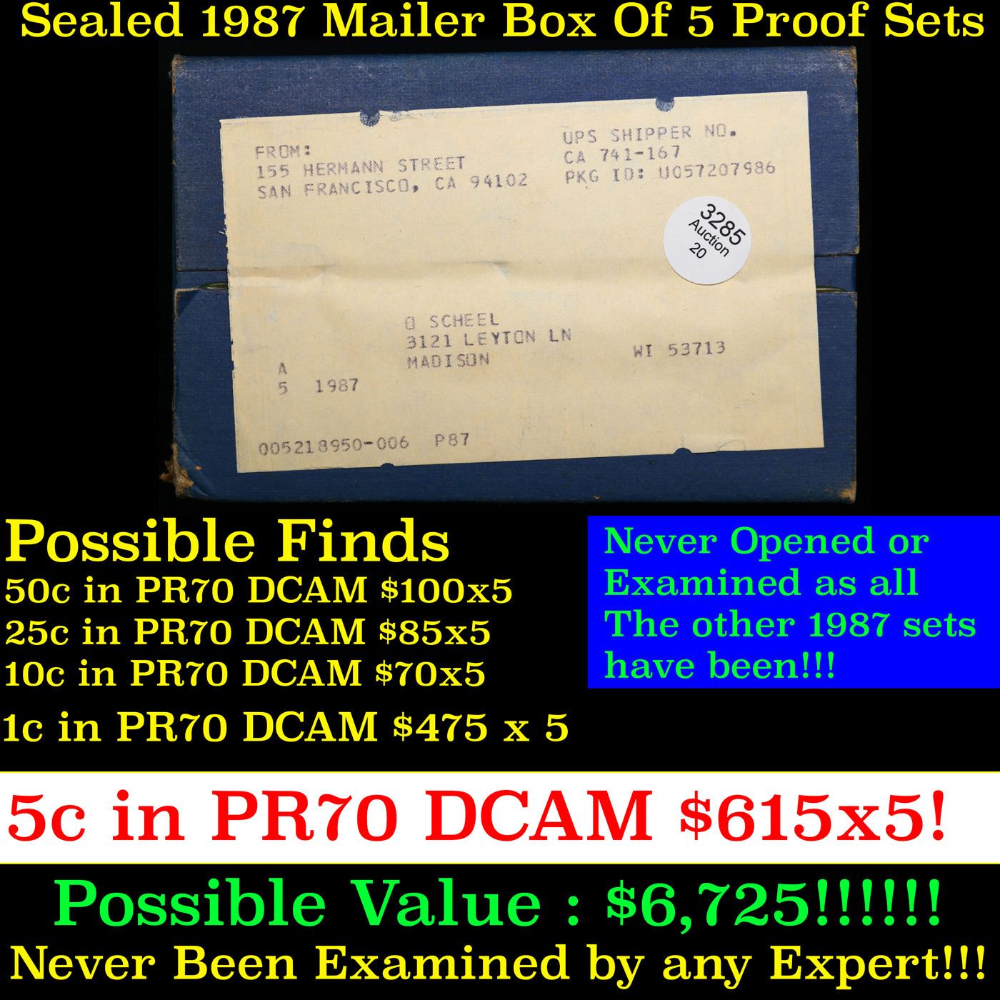 Original sealed box 5- 1987 United States Mint Proof Sets. Up for Auction is an Unopened Mailer Box from 1987 containing 5 1987 Proof Sets!!!! Wow! - This Mailer Box is sealed exactly as it left the mint over 40 years ago. Each Proof set in this mailer box has never been reviewed or examined by anyone. Virtually every 1987 Proof Set has been looked at by Coin Experts who have identified potential PR70 DCAM Coins and had them slabbed. Those opened Proof Sets you find at coin shows or for sale individually have almost certainly been examined and reviewed. NOT ONE OF THE FIVE SETS IN THIS MAILER BOX HAVE BEEN SEEN BY HUMAN EYES IN 40 YEARS , So, What COULD be in these Sets, Well here are the 5 things that could be inside. An Kennedy 50c in PR70 DCAM Trending $100, a Washington 25c in PR70 DCAM Trending $85, a Roosevelt Dime in PR70 DCAM Trending $70, BUT That’s Just the Start, There also could be a Lincoln 1c in PR70 DCAM, TRENDING $475, BUT EVEN THAT IS JUST THE SIDESHOW! The REAL WINNER IN THIS LOTTERY BOX IS The Jefferson Nickel, a 1987 PROOF Jefferson Nickel in PR70 DCAM TRENDS $615!!!! And there can be FIVE of Each in this BOX, This could be one of the very last boxes in EXISTENCE. This “WONKA” Box could Contain Coins Worth $6,725 - Good Luck in Obtaining This Unopened Mailer Box of 5 1987 Proof Sets!!!