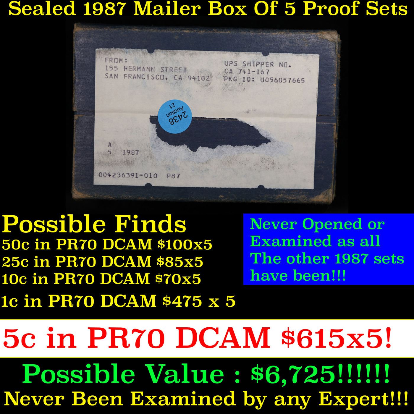 Original sealed box 5- 1987 United States Mint Proof Sets. Up for Auction is an Unopened Mailer Box from 1987 containing 5 1987 Proof Sets!!!! Wow! - This Mailer Box is sealed exactly as it left the mint over 40 years ago. Each Proof set in this mailer box has never been reviewed or examined by anyone. Virtually every 1987 Proof Set has been looked at by Coin Experts who have identified potential PR70 DCAM Coins and had them slabbed. Those opened Proof Sets you find at coin shows or for sale individually have almost certainly been examined and reviewed. NOT ONE OF THE FIVE SETS IN THIS MAILER BOX HAVE BEEN SEEN BY HUMAN EYES IN 40 YEARS , So, What COULD be in these Sets, Well here are the 5 things that could be inside. An Kennedy 50c in PR70 DCAM Trending $100, a Washington 25c in PR70 DCAM Trending $85, a Roosevelt Dime in PR70 DCAM Trending $70, BUT That’s Just the Start, There also could be a Lincoln 1c in PR70 DCAM, TRENDING $475, BUT EVEN THAT IS JUST THE SIDESHOW! The REAL WINNER IN THIS LOTTERY BOX IS The Jefferson Nickel, a 1987 PROOF Jefferson Nickel in PR70 DCAM TRENDS $615!!!! And there can be FIVE of Each in this BOX, This could be one of the very last boxes in EXISTENCE. This “WONKA” Box could Contain Coins Worth $6,725 - Good Luck in Obtaining This Unopened Mailer Box of 5 1987 Proof Sets!!!