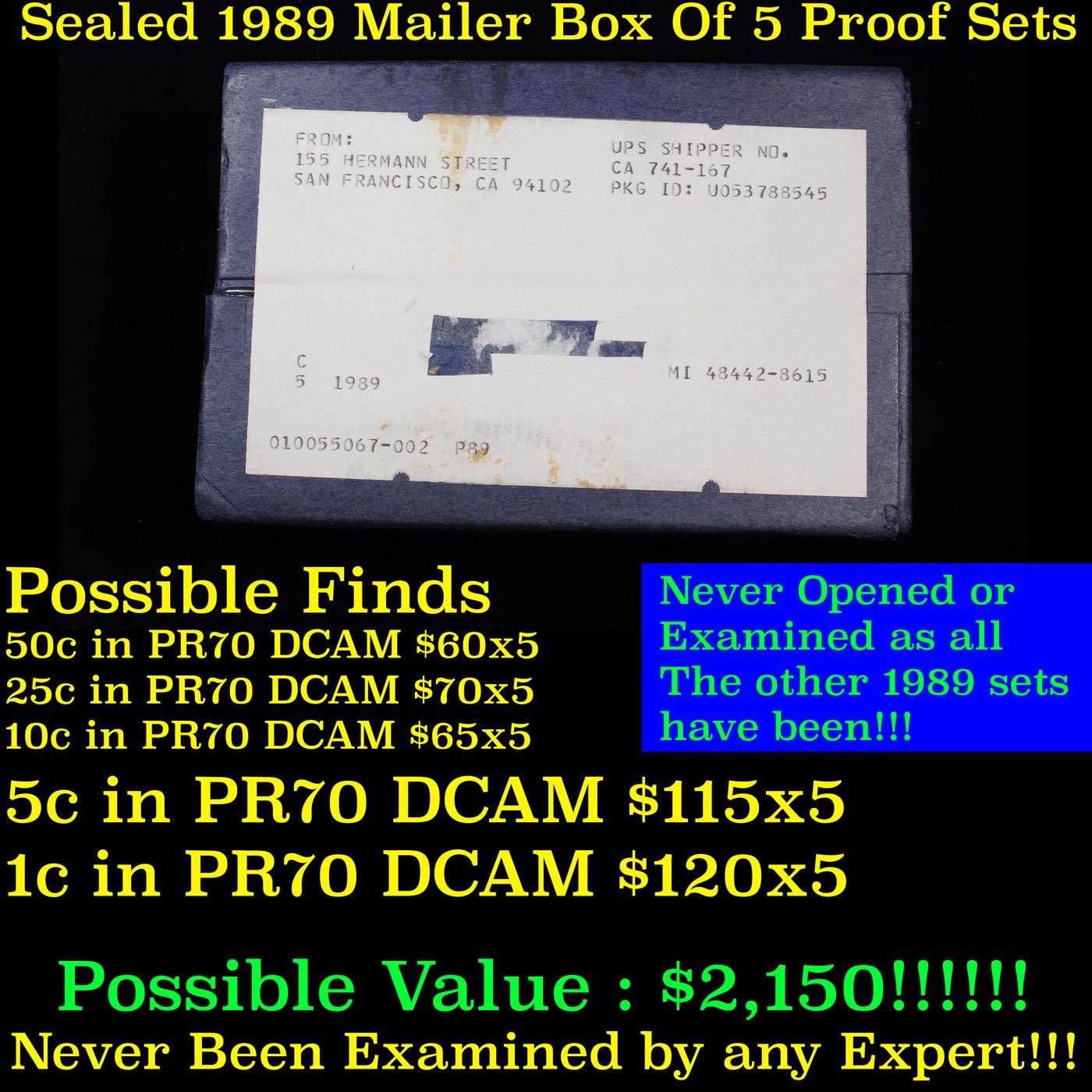 Original sealed box 5- 1989 United States Mint Proof Sets. Up for Auction is an Unopened Mailer Box from 1989 containing 5 1989 Proof Sets!!!! Wow! - This Mailer Box is sealed exactly as it left the mint over 40 years ago. Each Proof set in this mailer box has never been reviewed or examined by anyone. Virtually every 1989 Proof Set has been looked at by Coin Experts who have identified potential PR70 DCAM Coins and had them slabbed. Those opened Proof Sets you find at coin shows or for sale individually have almost certainly been examined and reviewed. NOT ONE OF THE FIVE SETS IN THIS MAILER BOX HAVE BEEN SEEN BY HUMAN EYES IN 40 YEARS , So, What COULD be in these Sets, Well here are the 5 things that could be inside. An Kennedy 50c in PR70 DCAM Trending $60, a Washington 25c in PR70 DCAM Trending $70, a Roosevelt Dime in PR70 DCAM Trending $65, BUT That’s Just the Start, There also could be a Jefferson 5c in PR70 DCAM, TRENDING $115 & a Lincoln 1c in PR70 DCAM Trending $120!!!! And there can be FIVE of Each in this BOX, This could be one of the very last boxes in EXISTENCE. This “WONKA” Box could Contain Coins Worth $2,150 - Good Luck in Obtaining This Unopened Mailer Box of 5 1989 Proof Sets!!!