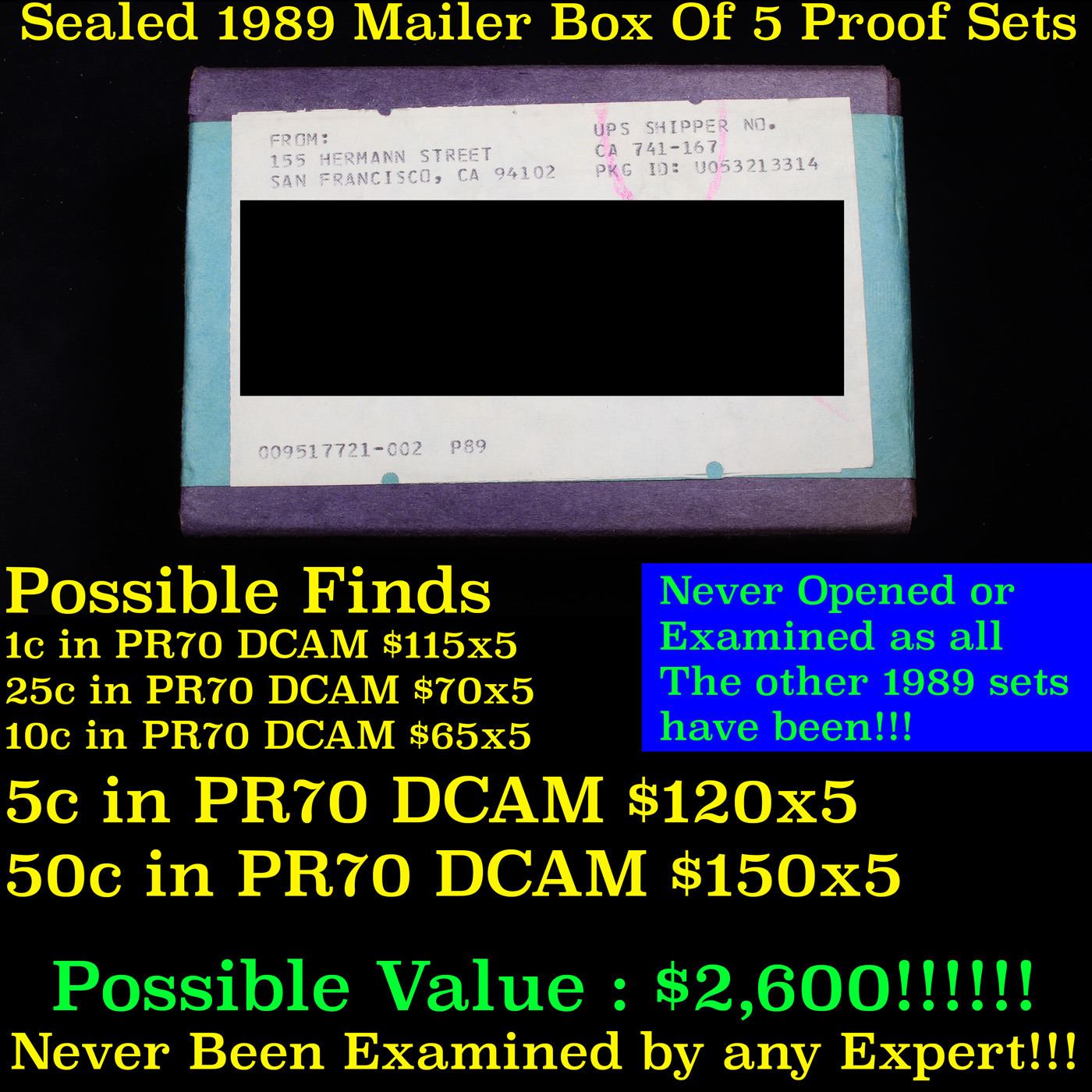 Original sealed box 5- 1989 United States Mint Proof Sets. Up for Auction is an Unopened Mailer Box from 1989 containing 5 1989 Proof Sets!!!! Wow! - This Mailer Box is sealed exactly as it left the mint over 40 years ago. Each Proof set in this mailer box has never been reviewed or examined by anyone. Virtually every 1989 Proof Set has been looked at by Coin Experts who have identified potential PR70 DCAM Coins and had them slabbed. Those opened Proof Sets you find at coin shows or for sale individually have almost certainly been examined and reviewed. NOT ONE OF THE FIVE SETS IN THIS MAILER BOX HAVE BEEN SEEN BY HUMAN EYES IN 40 YEARS , So, What COULD be in these Sets, Well here are the 5 things that could be inside. An Kennedy 50c in PR70 DCAM Trending $60, a Washington 25c in PR70 DCAM Trending $70, a Roosevelt Dime in PR70 DCAM Trending $65, BUT That’s Just the Start, There also could be a Jefferson 5c in PR70 DCAM, TRENDING $115 & a Lincoln 1c in PR70 DCAM Trending $120!!!! And there can be FIVE of Each in this BOX, This could be one of the very last boxes in EXISTENCE. This “WONKA” Box could Contain Coins Worth $2600 - Good Luck in Obtaining This Unopened Mailer Box of 5 1989 Proof Sets!!!