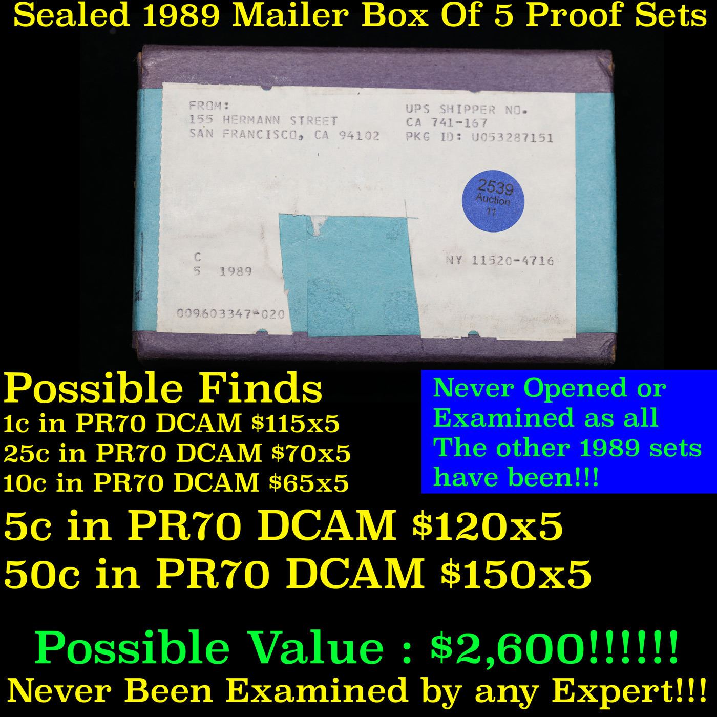 Original sealed box 5- 1989 United States Mint Proof Sets. Up for Auction is an Unopened Mailer Box from 1989 containing 5 1989 Proof Sets!!!! Wow! - This Mailer Box is sealed exactly as it left the mint over 40 years ago. Each Proof set in this mailer box has never been reviewed or examined by anyone. Virtually every 1989 Proof Set has been looked at by Coin Experts who have identified potential PR70 DCAM Coins and had them slabbed. Those opened Proof Sets you find at coin shows or for sale individually have almost certainly been examined and reviewed. NOT ONE OF THE FIVE SETS IN THIS MAILER BOX HAVE BEEN SEEN BY HUMAN EYES IN 40 YEARS , So, What COULD be in these Sets, Well here are the 5 things that could be inside. An Kennedy 50c in PR70 DCAM Trending $60, a Washington 25c in PR70 DCAM Trending $70, a Roosevelt Dime in PR70 DCAM Trending $65, BUT That’s Just the Start, There also could be a Jefferson 5c in PR70 DCAM, TRENDING $115 & a Lincoln 1c in PR70 DCAM Trending $120!!!! And there can be FIVE of Each in this BOX, This could be one of the very last boxes in EXISTENCE. This “WONKA” Box could Contain Coins Worth $2600 - Good Luck in Obtaining This Unopened Mailer Box of 5 1989 Proof Sets!!!