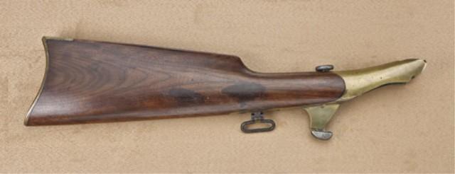 Original shoulder stock for 1851 Navy Colt serial #28203. Matching numbers on yoke, buttplate, and jaw. Correct screw. Original swivel. The stock is in good condition with some rusting on the swivel, minor pitting, also minor pitting on the screw The stock itself is good with a few areas of minor pitting and some bumps, but at least good overall and would look presentable with a Navy Colt with up to 60% finish. A rare Colt accessory. Est: $4,000 - $8,000