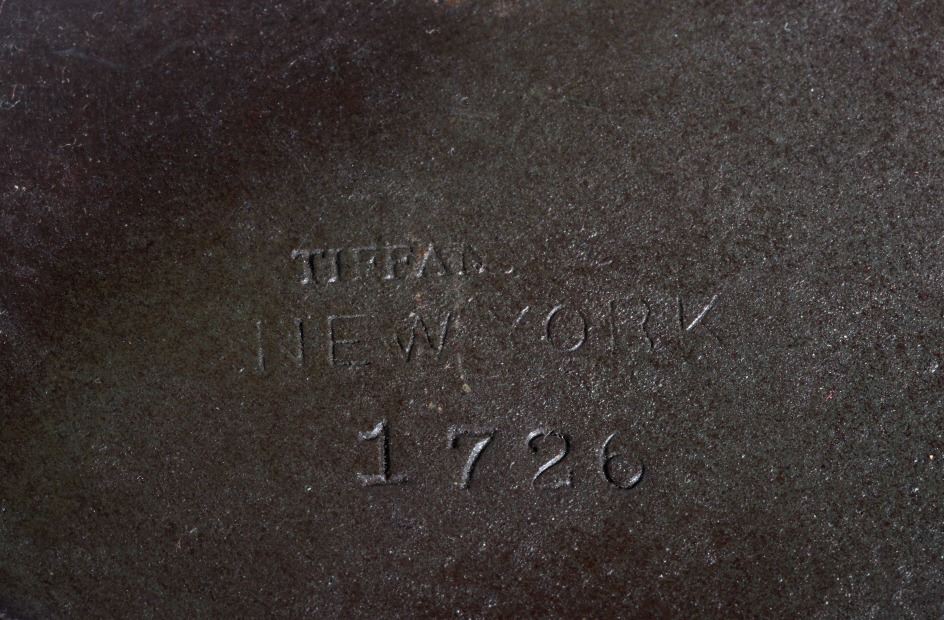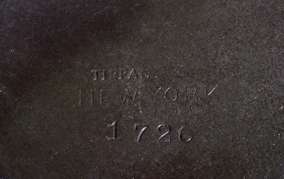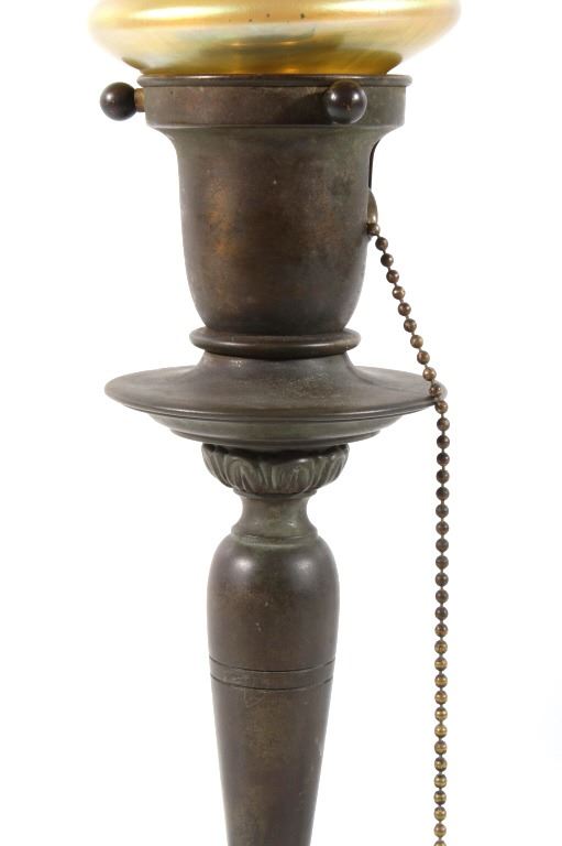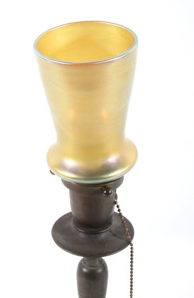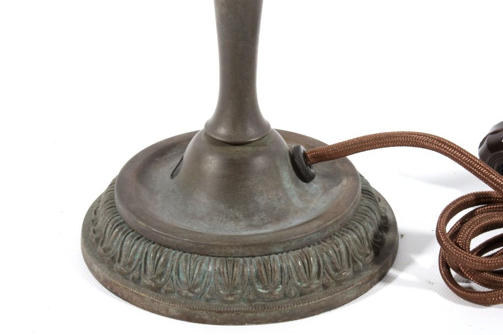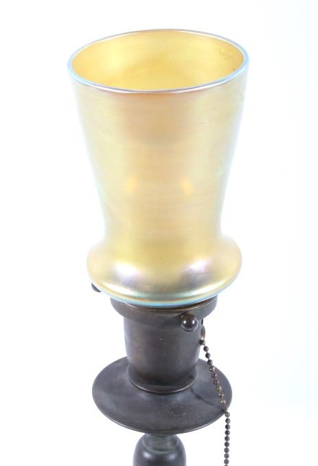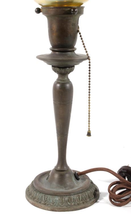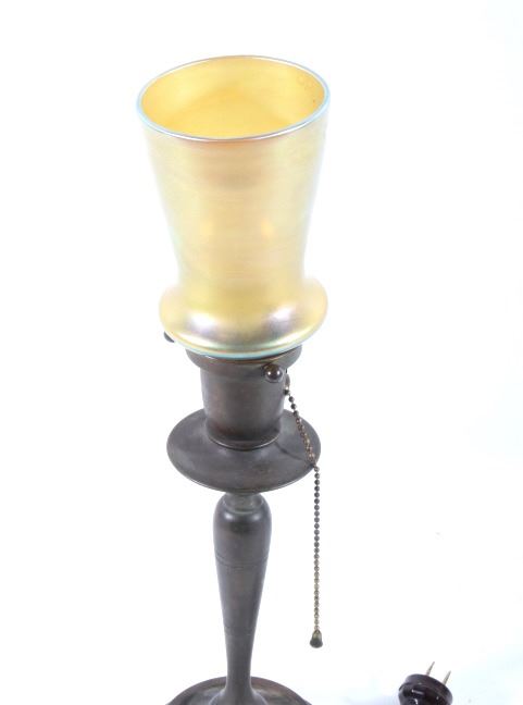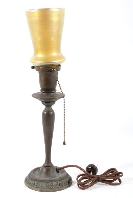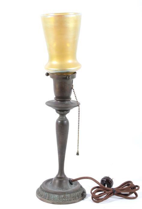 Included in this lot we have a original signed Tiffany Studios table lamp. The lamp shows original brass colored reflector shade. The base is made primarily of bronze and shows original patinaed color. The base shows clean design with some floral like patterns along the bottom and near the top of the piece. The lamp is marked on the bottom, reading "Tiffany New York 1726". The piece is in good condition and measures 17 1/4" tall with the base measuring just under 5" in diameter.