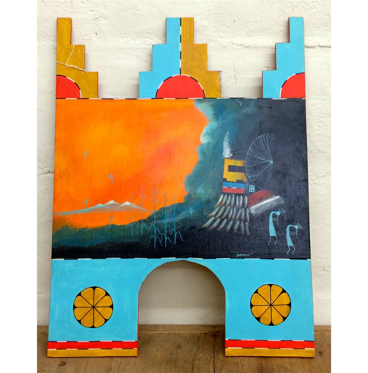 This colorful original is made to hang on your wall, but it is done in the style of a “tablita" that the Native ladies wear during certain dance ceremonies. It measures approx. 18” wide by 24” tall.