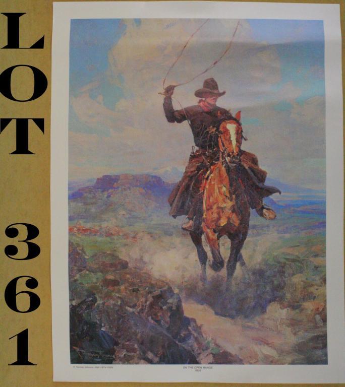 Original unframed color print by Western artist Frank Tenney Johnson entitled “On the Open Range” (1936) showing a cowboy on horse with lariat, approx. 25” x 19” with Certificate of Authenticity from the Johnsonestate. Est.: $100-$150.