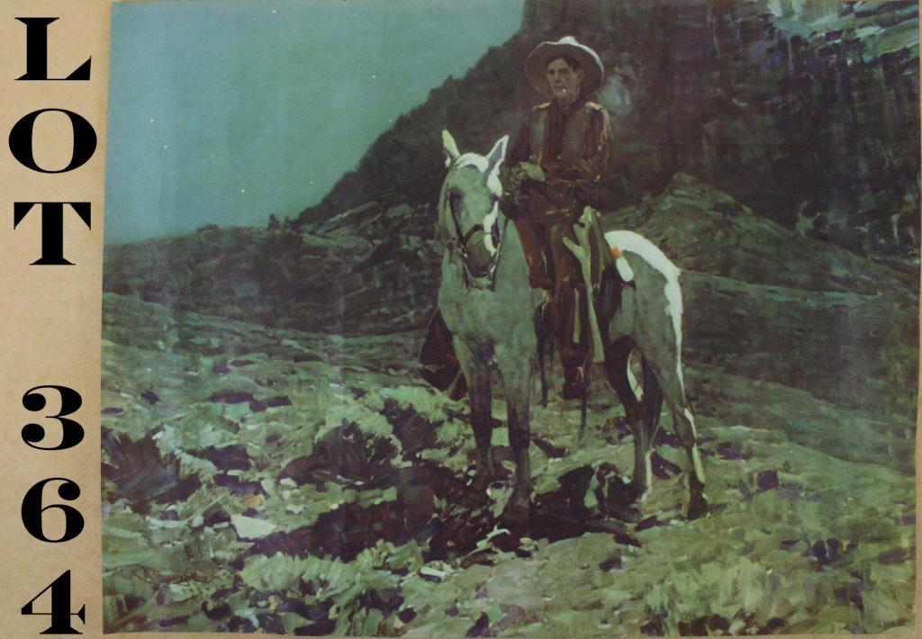 Original unframed color print by Western artist Frank Tenney Johnson showing a cowboy at night on his horse watching the herd, approx. 16” x 19” from the Johnson estate. Est.: $75-$125.