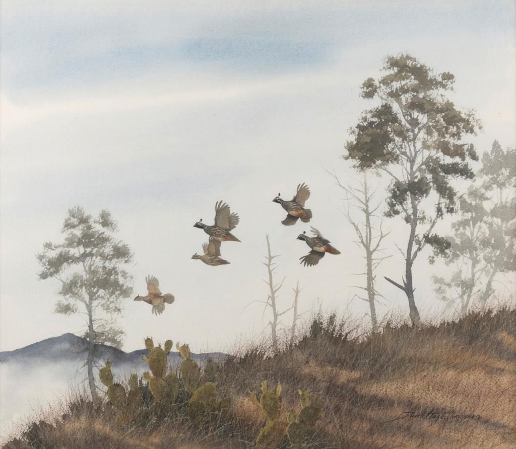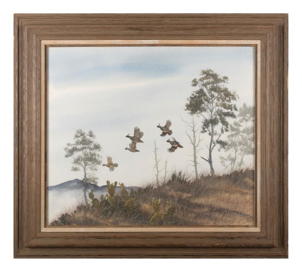 Original water color on paper signed David Hagerbaumer in lower right; measures 22” by 25”, nicely framed. Hagerbaumer is in the top tier of American Sporting artists with a fantastic and long career spanning 60 years plus. Formerly inthe Robert Petersen collection. Re-consigned. Est.: $1,000-$3,000.