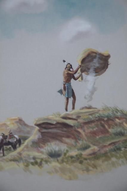 Original water color on paper signed lower right “Byron B. Wolfe” from his sketch book and entitled on matt “When Smoke Means Trouble” and also signed and remarked on lower right of the matting by the artist.This well known Kansas City artist worked on a cattle ranch before studying art at the University of Kansas. He is well known for his cowboy and Indian scenes and he was a member of the cowboy artists of America. His woks hang in Wyoming state gallery, Buffalo Bill Museum, Montana’s Historical Society and other major institutions. He was born 1904 died 1973 in Monument, Colorado. There is a story and inscription by the artist on theback of the painting dated 1968 and it explains the subject and title of this artwork. Est.;$500-$1,000.