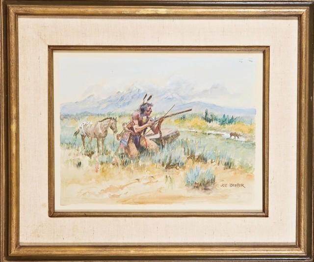 Original watercolor entitled “The Hunter” signed Joe Beeler (1931 - 2006), dated 1969. Approx. 14” by 18” (image). This recently deceased C.A. founder was well regarded for his Western scenes and this particularly nice watercolor shows Indian brave with tacked trade gun and in full regalia. Needs slight conservation and cleaning. From the Robert Petersen Collection. Est: $4,000 - $8,000