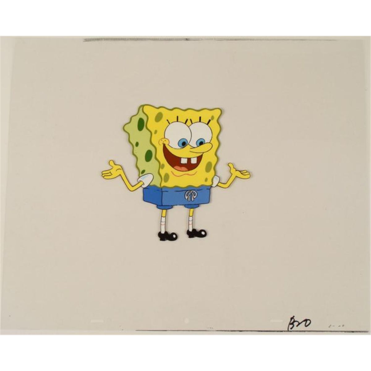 This original hand-painted cel is from the Nickelodeon TV show SpongeBob Squarepants. The story takes place under the deep blue sea in Bikini Bottom, where SpongeBob resides. SpongeBob, who is a yellow, porous sponge, is your typical happy-go-lucky character, as he is always cheerful and enjoys making people laugh. Patrick Star, SpongeBob's neighbor who is a starfish, boasts knowing nothing and is often getting himself into ridiculous situations. Between the homes of these two lies the home of the miserable Squidward, a squid, who is known for being grouchy and playing tricks on SpongeBob and Patrick. Both SpongeBob and Squidward work at the Krusty Krab, a fast food business run by the greedy money-loving Mr. Krabs, a crab, the arch rival of the evil, possibly misunderstood, Plankton. Another neighbor, Sandy Cheeks, an athletic squirrel who normally wears an astronaut's space suit, was introduced in "Tea at the Treedome." She spends most of her time inventing and experimenting. SpongeBob in this large cel appears to be saying "Well, Whadya Know?" * * Overall size of cel: 16 1/2" x 13 1/2"Very good condition * This is an original hand-painted cel set-up used in the production of an episode of "SpongeBob SquarePants." Each one-of-a-kind set-up represents a slight change in position of the characters. When individually photographed and projected in rapid succession, the images appear to move. * To create production cels, the original animator's drawing is transferred onto an acetate cel (by hand-inking and/or photo copying). The cel is then hand-painted on the reverse side * The bottom of the sheet has peg holes, and the animator's notations. *