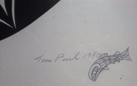 35 years old painting by first nation artist Tim Paul salmon & moon, very well kept;16 x 12 framed; this painting has no prints..... so its very valuable........ signed by Tim paul. Artist : Tribe: Hesquiaht / Nuu Chah NulthTim Paul learned carving skills at the Arts of the Raven Gallery, in Victoria in 1975. He then assisted Richard Hunt in the Royal British Columbia Museum's carving programme at Thunderbird Park in Victoria. Since 1976, Tim Paul has been a senior carver at the Royal British Columbia Museum. In addition to being a talented carver, Tim Paul is a gifted graphic artist. He has released limited edition silkscreen prints that have as their subject matter various legends of Nuu Chah Nulth culture. Tim also paints in acrylic. Whatever the medium, Tim Paul's work is characterized by a high level of skill and originality. Tim is dedicated to upholding traditions of his culture through his teaching in addition to his work as an artist.