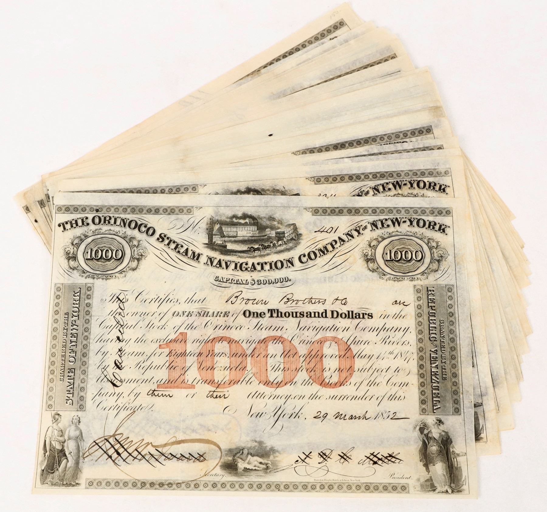 Lot of 30 stocks issued in the 1850s. Pen cancelled. Rare group! The Orinoco Steam Navigation Company was founded in New York around 1848 with a capital of $300,000 to operate steamboats on the Orinoco River in Venezuela, providing transport for goods and possibly passengers. Its operations faced challenges, notably when its steamer Apure was attacked by rebels in 1865 while carrying Venezuelan troops, sparking diplomatic disputes between the U.S. and Venezuela. Though short-lived, the company is notable for being an early American venture into river navigation in South America and for the international legal issues that arose from its activities.
