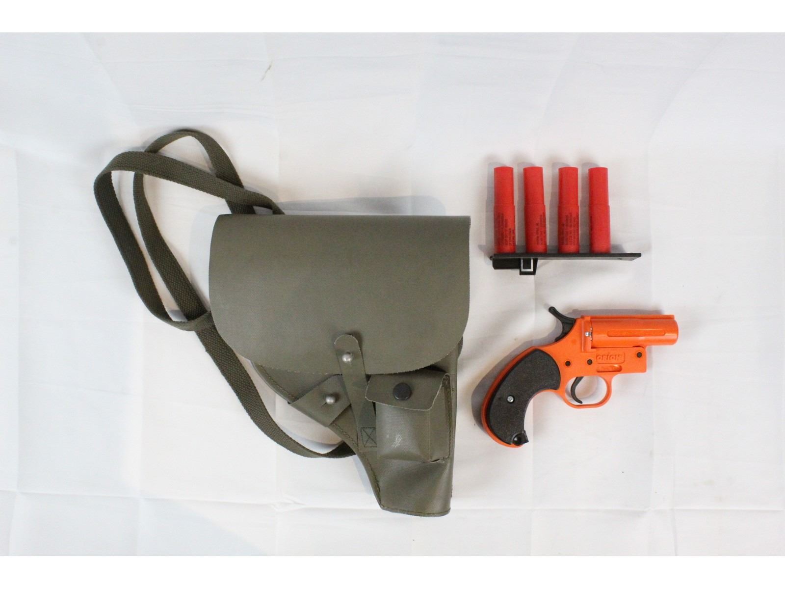 Orion flare gun with original flares and clip plus two shorter Orion brand flares. Holster is not Orion original. Very good condition, see photos.