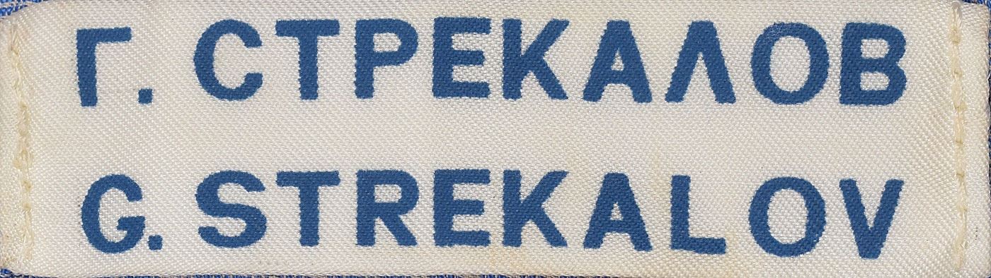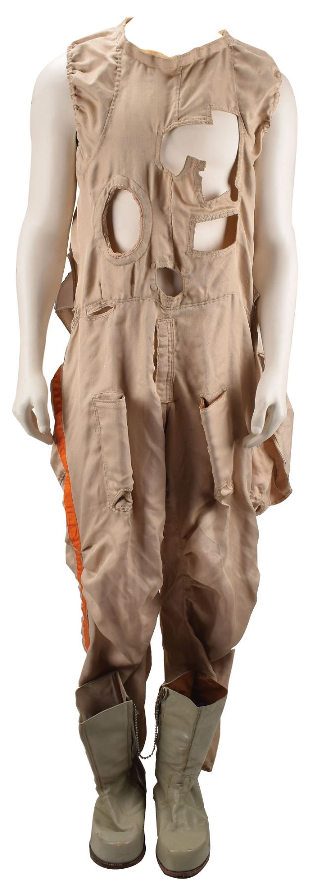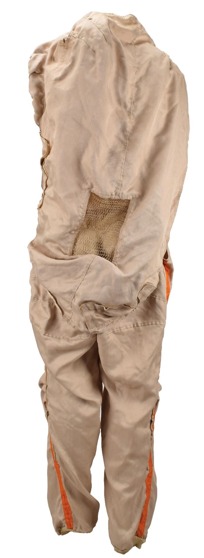 Coverall garment for the Soviet Orlan-D space suit, with a Velcro-secured neck opening, elastic arm holes, and openings in the front for the suit's valves and control panel. The back has a large open flap to accommodate the suit's life support backpack, an integrated system which allowed temperature regulation, pressurization, air collection and purification, and housed the radio and electrical apparatus. The light gray nylon coverall has orange stripes down the sides, and pockets on the front of each thigh. Includes a pair of zippered leather 'walking out' high boots affiliated with the Sokol-KV2 suit: the right boot has a light gray suede lining, and the left boot has a smooth brown lining. In overall very good condition, with some scattered soiling to the coverall and boots, and creasing to the boots' leather. The Orlan-D space suit was developed from 1969 to 1977, derived from the Krechet suit intended for use on the lunar surface, and used for extra-vehicular activities from the Soviet space stations Salyut-6 and Salyut-7 from 1977 to 1984.