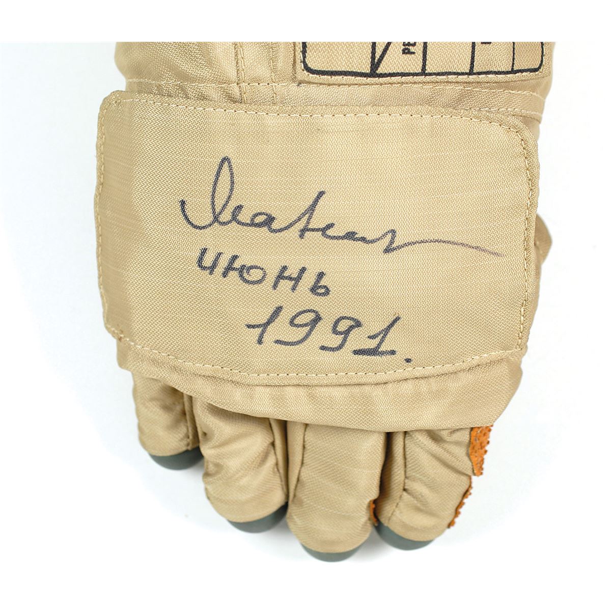 Pair of gloves for an Orlan EVA spacesuit, the left glove serial numbered [Cyrillic characters approximated] "rn-7K-11b-0350219" and the right hand serial numbered "rn-8K-1-0210120," signed on the right-handed glove's Velcro-close flap over the knuckles in black felt tip by Musa Manarov and dated 1991. The gloves measure 14? long and consist of an insulated nylon canvas outer surface and inner pressure glove with pebbled orange rubber palm and smooth green fingertips. Scattered soiling and staining to the unsigned glove, otherwise overall fine condition. Given the 1991 notation, these gloves would date to the Soyuz TM-11 mission on which Manarov served as Flight Engineer.