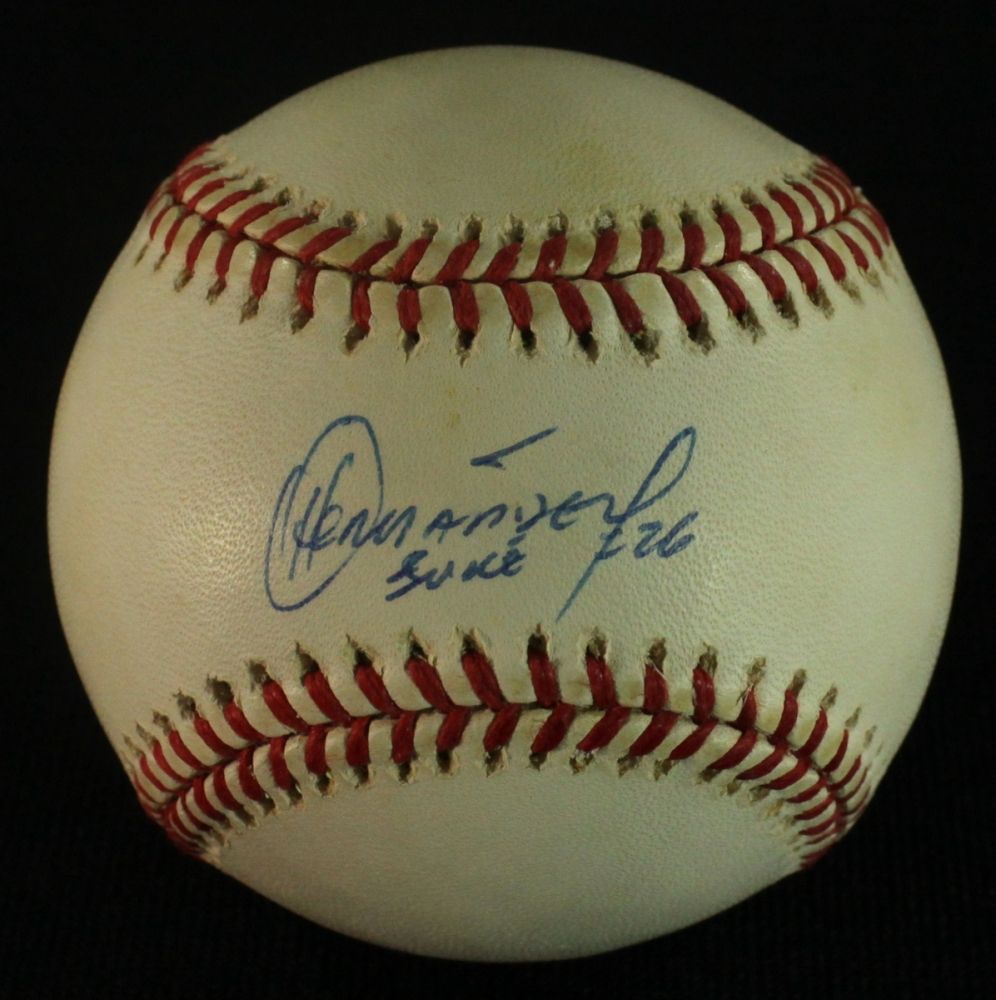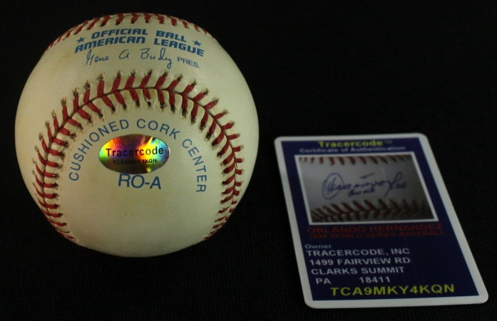 Official American League Baseball. Hand-signed and inscribed in blue ink by Orlando Hernandez (Yankees). Autograph includes a Tracercode hologram and matching COA for authenticity purposes.