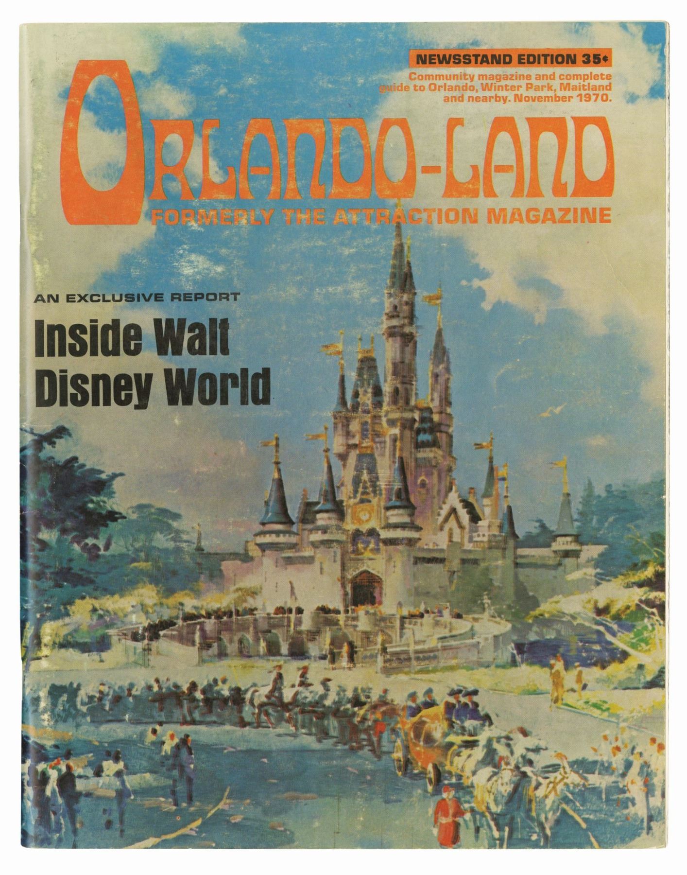 (Walt Disney World, 1970) An issue of "Orlando-Land" Magazine from November of 1970. This 72-page issue features beautiful concept art for Cinderella Castle on the cover and provides an exclusive pre-opening report inside Walt Disney World. The magazine measures 10"x8" and is in good condition with some fading to the cover and edge-wear to the spine from aging.