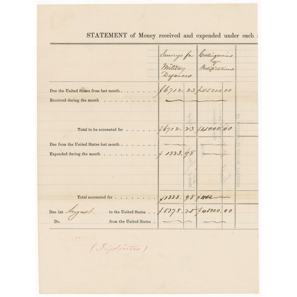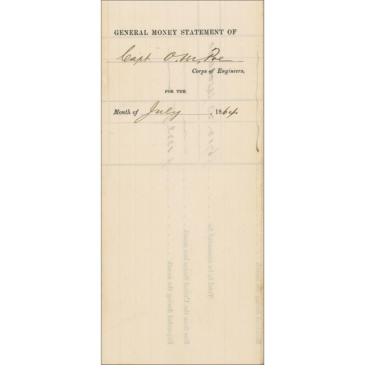 Union general (1832–1895) who participated in General Sherman’s March to the Sea and was responsible for much of the lighthouse construction on the Great Lakes. Partial DS, signed “Capt. O. M. Poe,” one page both sides, 7.75 x 10.5, July 1864. Expenditures statement signed on the reverse by Poe as a member of the Army Corps of Engineers. In fine condition, with two fold lines and light overall toning, slightly heavier along the folds.