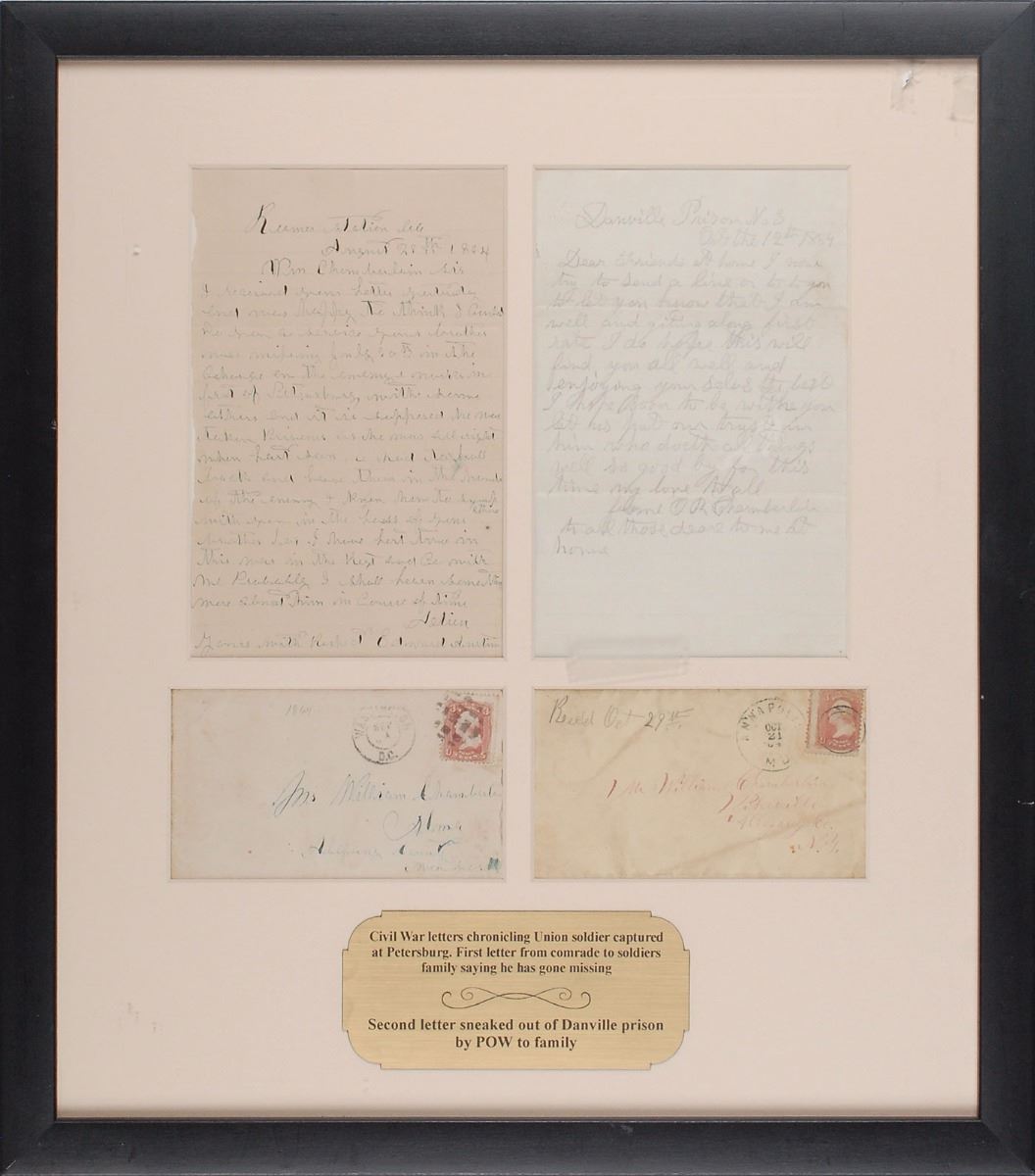 Interesting pair of letters related to the situation of Orlando R. Chamberlain, a Union soldier captured at Petersburg and held at Danville Prison. First is an ALS from one of his comrades to Chamberlain’s family, signed “Edward,” one page, August 29, 1864, in part: “Your brother was missing July 30th…on the enemy’s works in front of Petersburg with some others and it is supposed he was taken prisoner as he was all right when last seen. We had to fall back and leave them in the hands of the enemy.” A letter in pencil from Chamberlain to his family, signed “O. R. Chamberlain,” one page, October 12, 1864, written from “Danville Prison No. 3,” in part: “Dear friends at home I now try to send a line on to you to let you know that I am well and giting along first rate…I hope soon to be with you.” Both original mailing envelopes are included, with the envelope for Chamberlain’s letter addressed in another hand, suggesting that it was smuggled out of the prison to be mailed. Matted and framed with a plaque to an overall size of 16.5 x 19. In fine condition, with creasing and soiling to envelopes.