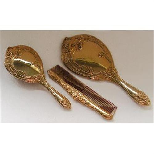 Produced in bright heavy gold ormolu this very well made Art Nouveau ladies dresser set consists of a hand mirror, hair brush and comb. All three pieces feature an intricate swirling floral design on the backs, their fronts and on the handle. A similar ormololu pieces are shown on in Ettinger: Antique Dresser Sets; 1890-1950s. The mirror measures 5 inches in diameter - 10 1/2 inches long incuding the handle - the hair brush measures 8 1/2 inches long - the comb measure 7 1/2 inches long. All three pieces, of this high quality vanity set are in excellent condition.