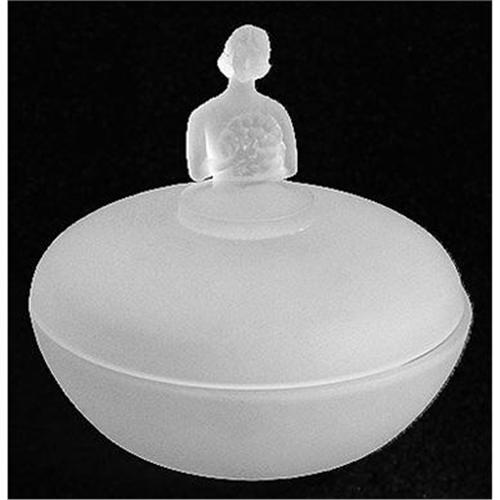 Known as Lillian VI this powder jar is shown and described on pages 30-31 of Whitmyer: Bedroom & Bathroom Glassware Of The Depression Years. The finial features a lovely young lady, from the waist up, holding a fan. Produced in crystal satin glass, the only color it has been found in, circa 1930. The base is large round and smooth, the lid the same. Measuring about 5 1/2 inches tall x 5 1/2 inches across the rim and in excellent condition.
