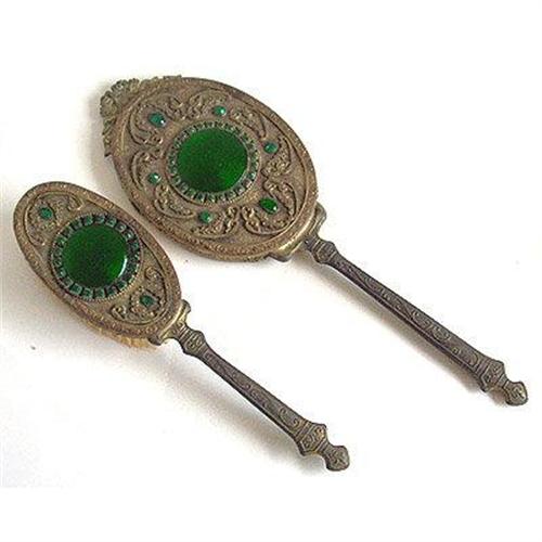 Produced by Empire Art Gold, circa 1920, and designed with elements of Victorian, Edwardian, and Art Nouveau styles. This large and heavy brass or ormolu hand mirror and hairbrush dresser set was produced circa 1920. Both their tops are bordered with a reticulated pattern - symmetrically placed scrollwork and floral wreath medallions, adorned with  green glass jewels, centered with a large round green guilloche cabochon surrounded by several dozen  green glass prong set jewels. Long sculpted handles with intricate patterns complete each piece. Although pictured and described on page 28 in Ettinger: Antique Dresser Sets 1890s-1950s. Although we were unable to locate the maker?s markings it was produced by EMPIRE ART GOLD as the matching vanity jar, available in a separate auction, is marked - E. & J.B. Empire Art Gold, surrounding a crown. The hand mirror measures 14 inches long ? the hair brush 10 1/2 inches and both, with the exception of wear to the patina due to age, are in excellent condition without any damage to, or loss of, any glass jewels.