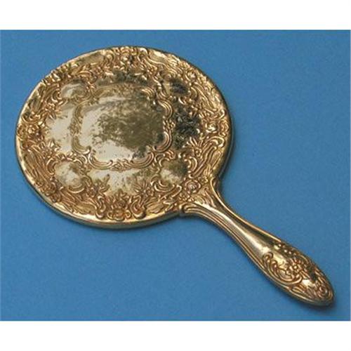 Produced in bright gold ormolu, circa 1930, this exquisite ladies dresser hand mirror features an intricate floral design on the back, the front and on the handle. A similar ormolu mirror is shown on page 34 in Ettinger: Antique Dresser Sets; 1890-1950s. The mirror measures 5" in diameter - 9 1/2" long incuding the handle and with the exception of a very small chip on the edge of the mirror, where it meets the metal, the condition is excellent.