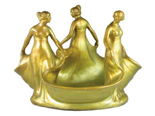 Porcelain faience, green eosin glaze. Bowl with shaped border, depicting the three Graces. Marked: impressed 7685. number and stamped mark. Zsolnay, Pécs, 1910s. Size: 20 cm, diameter: 28 cm