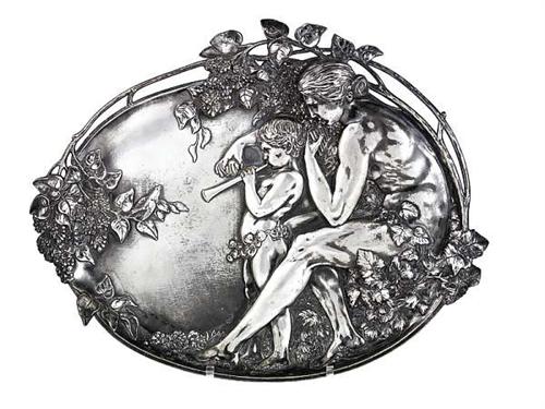 Silver-plated pewter. Music lesson in the open air. Marked: W. M. F., Württenbergische Metallwaren Fabrik, Geislingen, late 19th century. Size: 39 x 31 cm