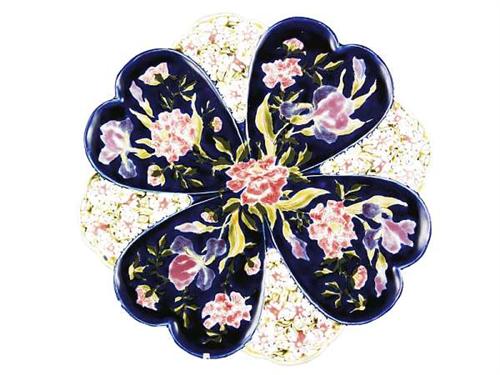 Porcelain faience, so called lucky dish. Four-leaf clover, colour painted flowers on the surface, pierced decoration. Number impressed on the bottom: (3521) and factory mark, family mark with under glaze blue. Zsolnay, Pécs, circa 1890 Diameter: