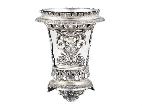 Silver, 339 g. Pressed, pierced and rolled decorations on the glass holder, simple glass with everted rim inside. Marked: P. Corsini, mid 19th century. Size: 13.5 cm