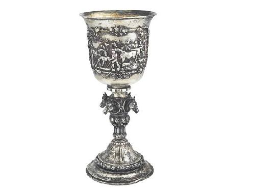 Silver, 641 g, gilt interior. Round, stepped base with laurel wreath, On the stem there are four plastic horse heads. On the cup there is a horse scene with dogs surrounded by oak-branches. The border of the base is slightly dented. Marked: 13 lat (26 ounces) fineness. German, circa 1870 Size: 30 cm
