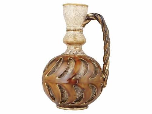 Porcelain faience, pierced, with twisted handle, light-brown glaze and gilt Marked: impressed(892) number and factory mark Zsolnay, Pécs, 1882. Size: 28.5 cm