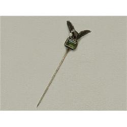 Silver, pin with angular shape emerald, sitting eagle figure with 1 tiny pearl, rest of gilt, circa 1900, unmarked, weight: 4.2 g, in good condition.