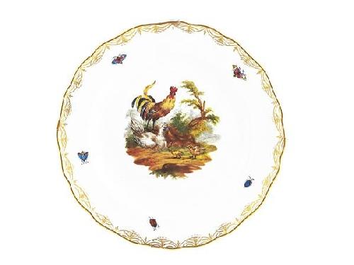 Porcelain. In the interior there is a colour painted rooster and hen with chickens. On the rim there are insects and gold painting. White ware from the factory painted later. Marked: Meissen, late 19th century. Diameter: 24.5 cm