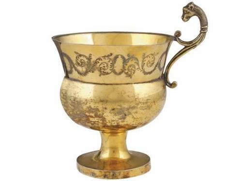 Gilt silver, 158 g. Cast lion handle, stylised, matted decoration on the surface. Marked: French, between 1809 and 1819, Austrian untax stamp (1810-1824). Size: 12 cm