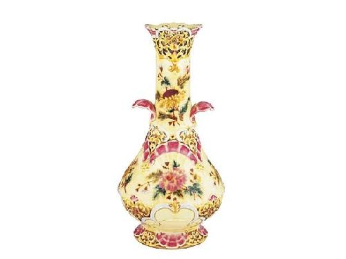 Porcelain faience, plastic and pierced decoration. Bone colour ground, colour painting and gilt, shells and oriental flower decoration. Fire cracked. Marked: pressed number 3980 (1893-1894 years) and factory mark, made in Austro-Hungary, stamped five towers. Zsolnay, Pécs, circa 1894 Size: 34 cm