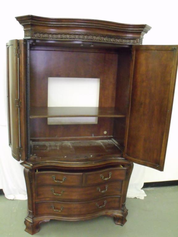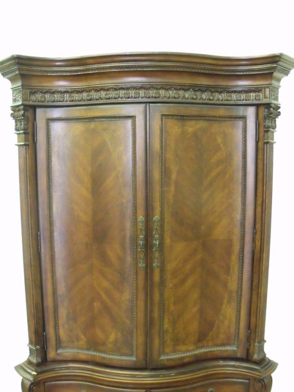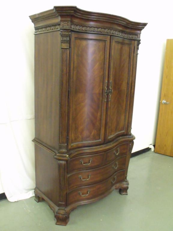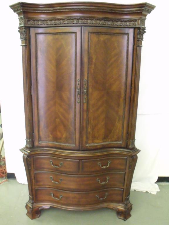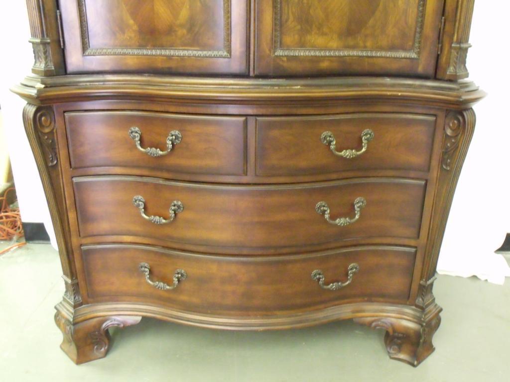 Elaborate two piece dark wood airmoir with decorative boarder trim, serpantine front. Has felt lined drawers, top could be entertainment center or closet. 84" tall 48" long 25" deep. In near new condition.